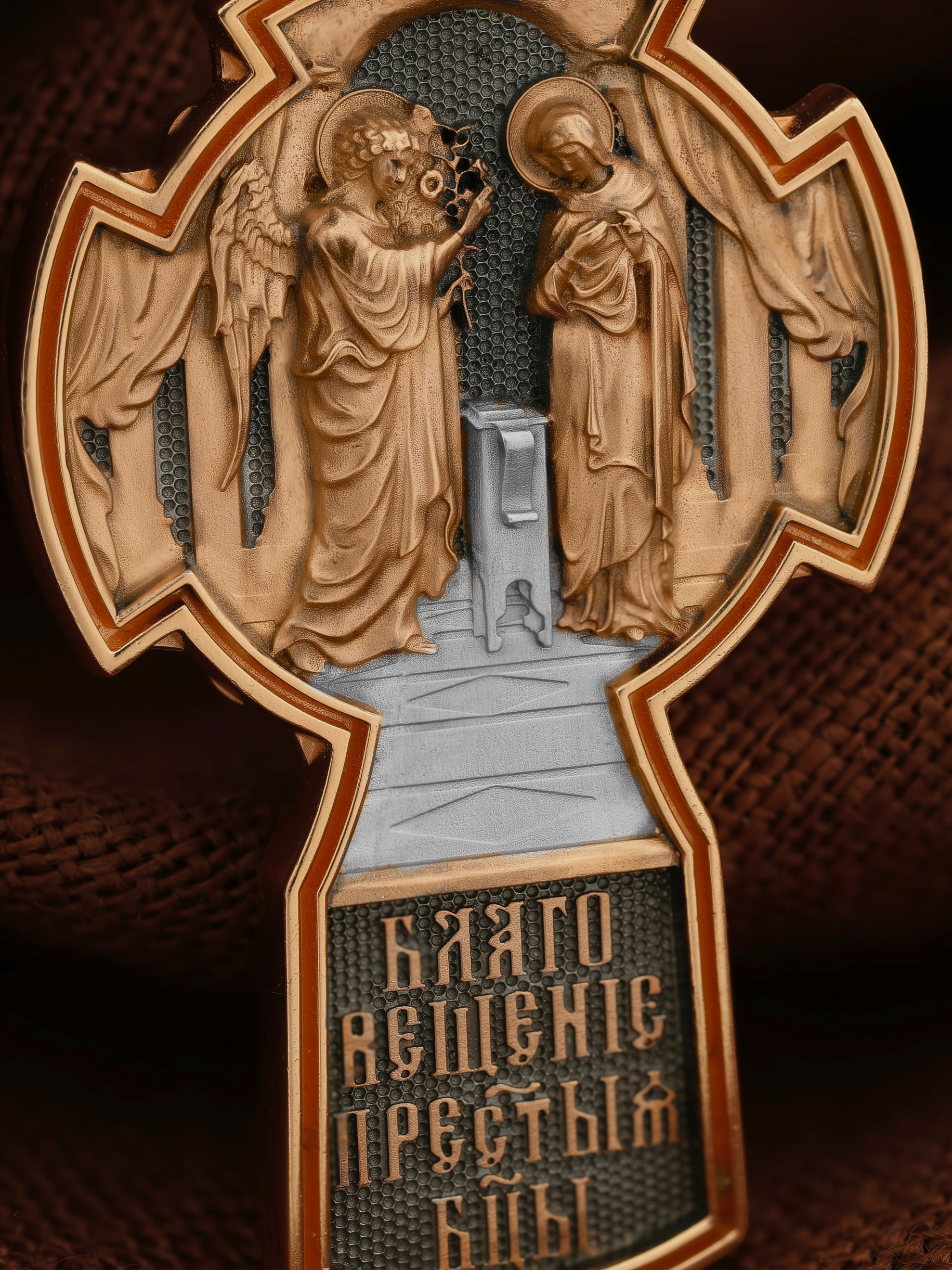 На оборотной стороне креста изображена икона «Благовещение Пресвятой Богородицы». Как нам повествует Священное Писание, Архангел Гавриил послан был от Бога в город Назарет к Пресвятой Деве Марии с радостной вестью, что Господь избрал Ее быть Матерью Спасителя мира. Ангел сказал: «Радуйся благодатная! Господь с Тобою! Благословенна Ты между женами». Мария cмутилась от слов Ангела и думала: что значит это приветствие? Ангел же продолжал говорить Ей: «не бойся, Мария, ибо Ты обрела благодать у Бога. И вот, Ты родишь Сына и наречешь имя Ему Иисус. Он будет велик, и назовется сыном Всевышнего, и Царству Его не будет конца…» На кулонном кольце изображен Ангел Серафим.