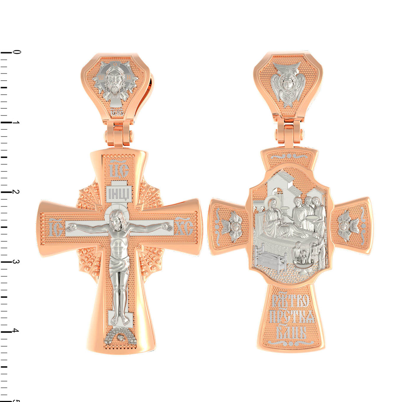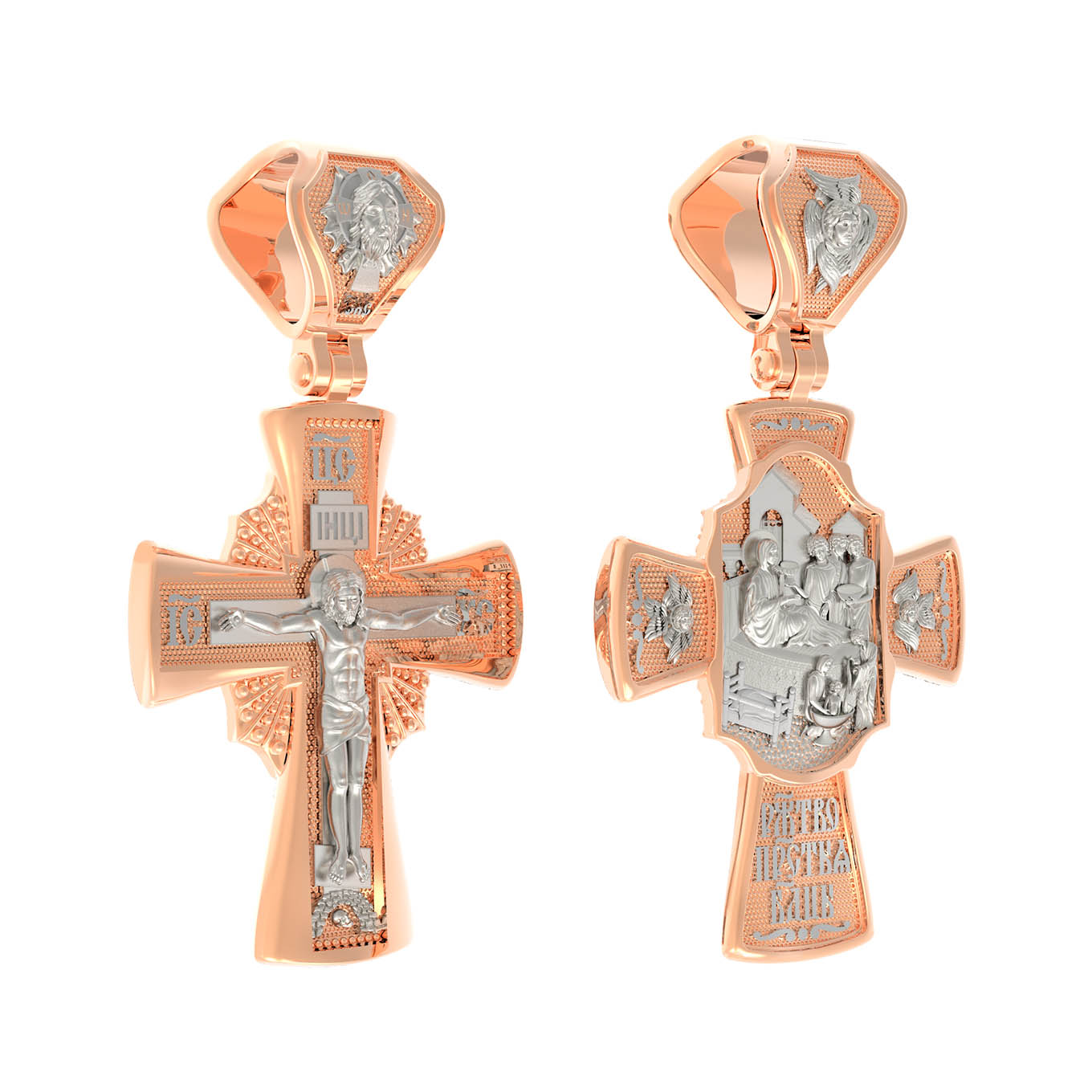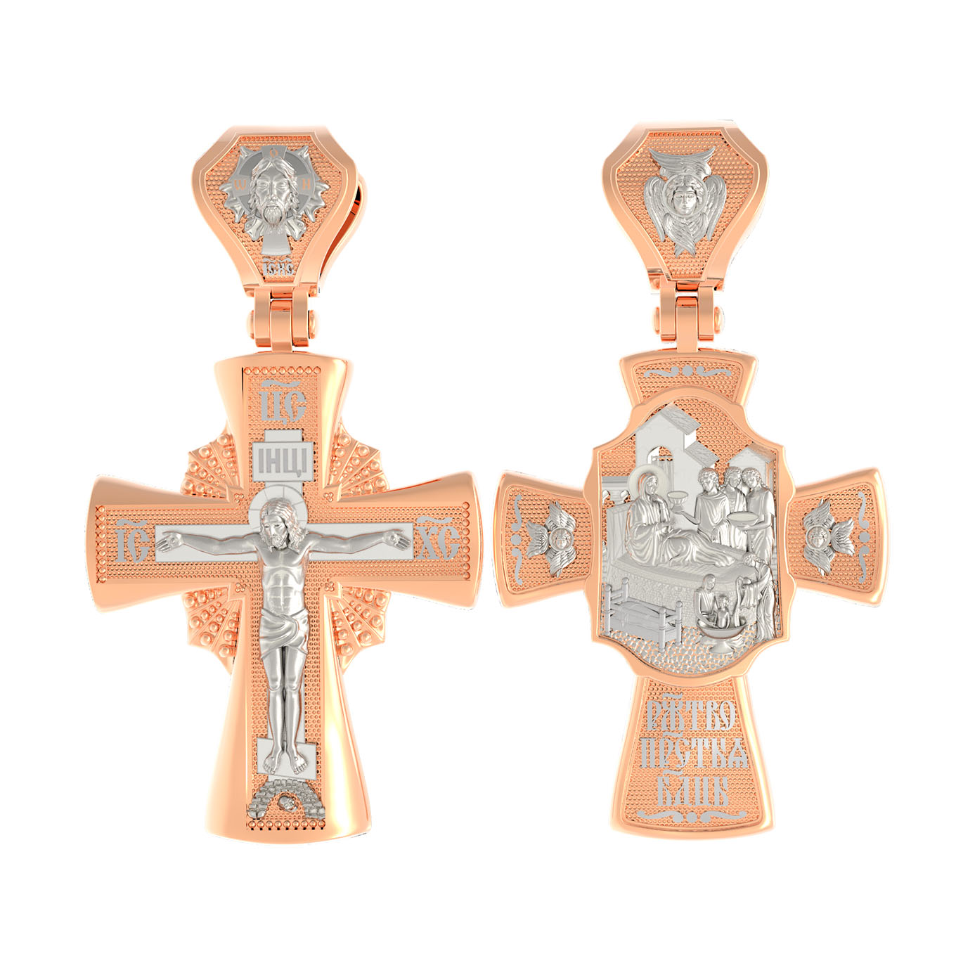 На лицевой стороне креста изображено Распятие Господа и Спасителя нашего Иисуса Христа, отдавшего Себя на смерть, для искупления грехов мира. Крест является символом жертвенной любви Всеблагого Бога к падшим людям, всепобеждающим духовным оружием христиан, основанием и средоточием церковной жизни. Господь сказал: кто хочет идти за Мною, отвергнись себя, и возьми крест свой, и следуй за Мною. (Мк. 8: 34). Над Распятием помещена надпись «Царь Славы». На верхней табличке, выше головы Иисуса, расположена надпись, составленная Понтием Пилатом — «IНЦI». Она означает «Иисус Назорей, Царь Иудейский». Надпись «IC» «ХC», означает Иисус Христос, помещается на разных сторонах поперечной перекладины креста. Возвышение, на котором стоит Крест, символизирует гору Голгофу, на которой произошло Распятие. Под подножием Креста изображена покоящаяся голова (череп) Адама. На кулонном кольце изображен Нерукотворный образ Господа и Спасителя нашего Иисуса Христа, чудесно отпечатавшийся на плате, которым Христос вытер свой лик. Ниже надпись — «IC» «ХC».
