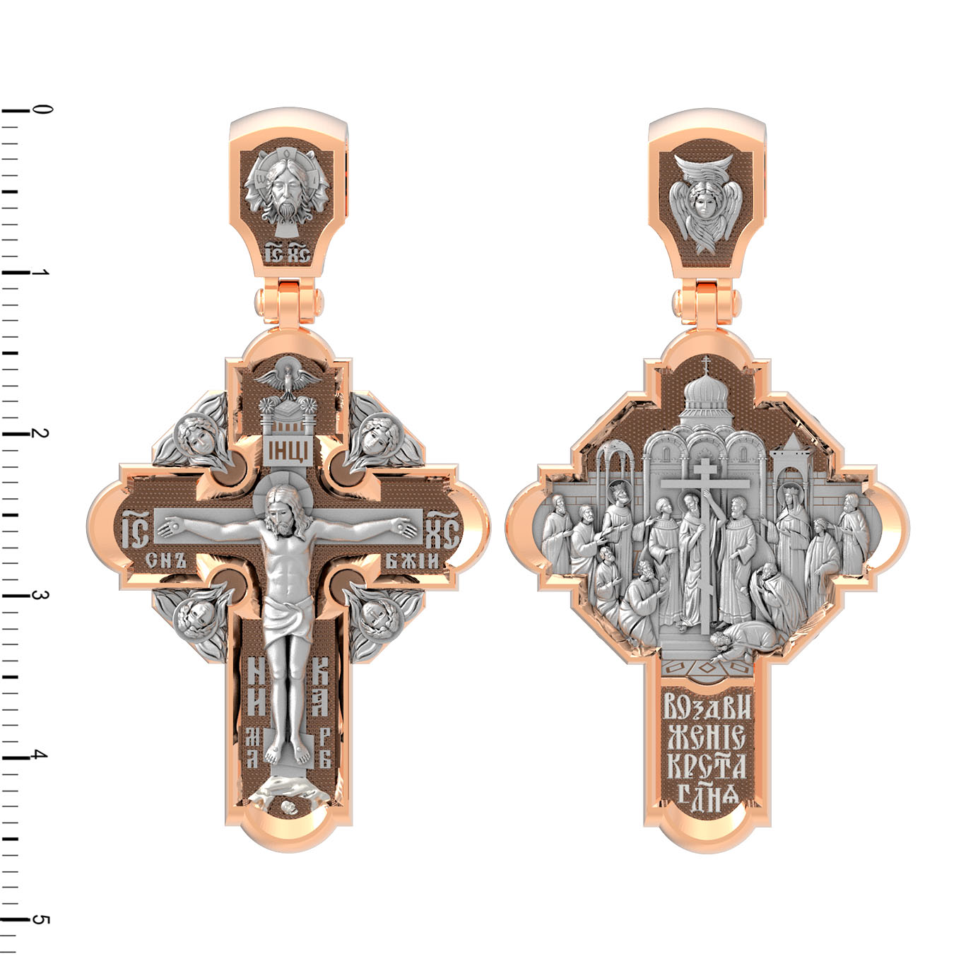 На оборотной стороне креста изображена икона Воздвижение Честного и Животворящего Креста Господня. Равноапостольный царь Константин пожелал построить храмы Божии на священных для христиан местах в Палестине и найти Крест, на котором был распят Спаситель. Исполнить желание царя взялась, с великою радостью, его мать, св. равноапостольная царица Елена. Крест был обретен в 326 году около горы Голгофы в Иерусалиме. C VII века с этим днём стали соединять память о возвращении Животворящего Креста из Персии византийским императором Ираклием (629). Праздник называется Воздвижением Креста, потому что и при обретении, и при возвращении Креста патриарх Макарий поднимал (Воздвигал) крест три раза, чтобы все могли его видеть. Народ же, видя Крест Спасителя, кланялся и восклицал: «Господи, помилуй!». Св. равноапостольные цари Константин и Елена, над местом страданий, погребения и воскресения Иисуса Христа построили обширный и великолепный храм в честь Воскресения Христова. На кулонном кольце изображен шестикрылый Ангел — Серафим.