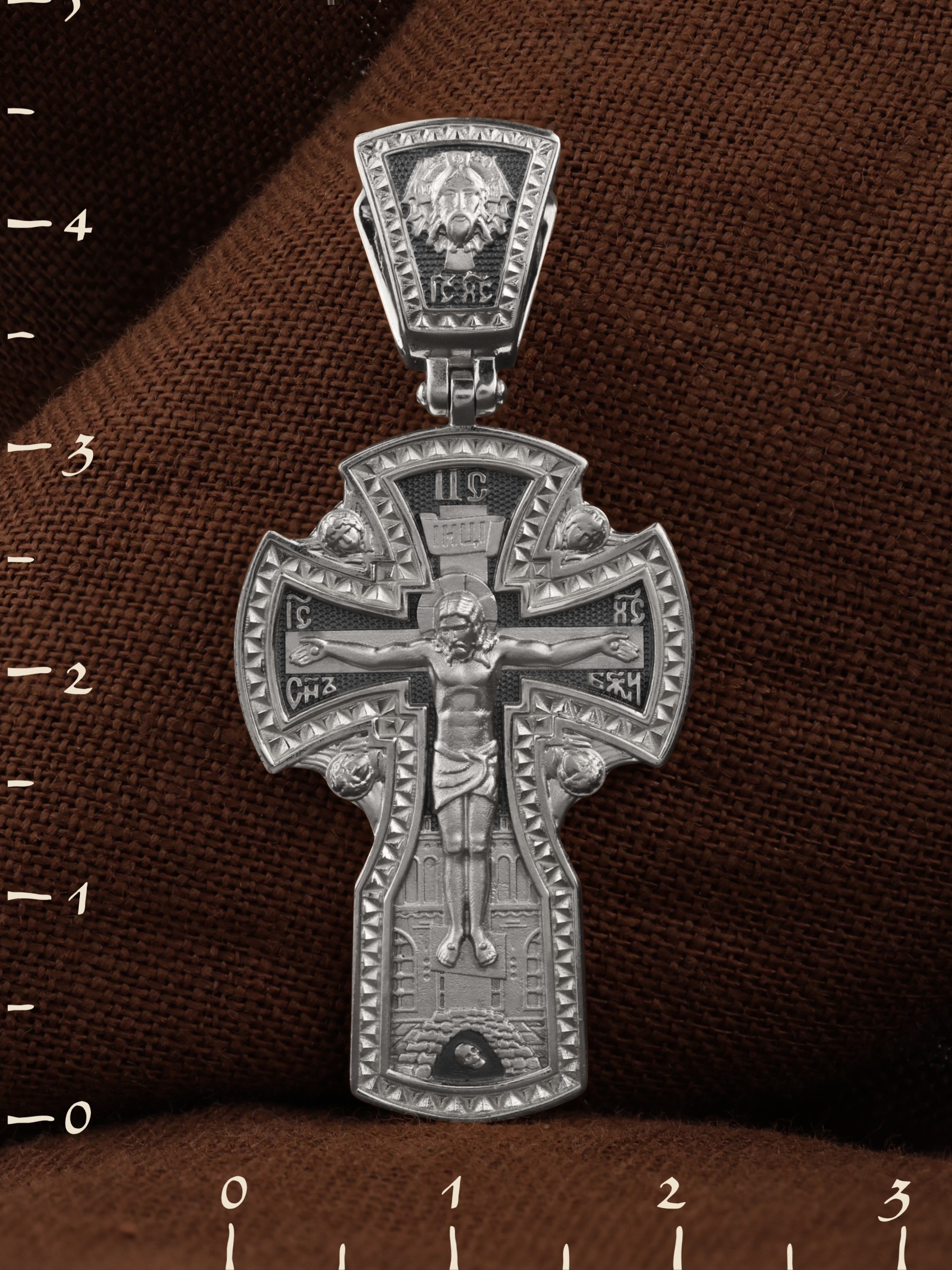 На лицевой стороне креста изображено Распятие Господа и Спасителя нашего Иисуса Христа, отдавшего Себя на смерть, для искупления грехов мира. Крест является символом жертвенной любви Всеблагого Бога к падшим людям, всепобеждающим духовным оружием христиан, основанием и средоточием церковной жизни. Господь сказал: кто хочет идти за Мною, отвергнись себя, и возьми крест свой, и следуй за Мною. (Мк. 8: 34). Над Распятием помещена надпись «Царь Славы». На верхней табличке, выше головы Иисуса, расположена надпись, составленная Понтием Пилатом — «IНЦI». Она означает «Иисус Назорей, Царь Иудейский». Надпись «IC» «ХC», означает Иисус Христос, помещается на разных сторонах поперечной перекладины креста. Рядом расположена надпись «Сын Божий». За крестом высится Иерусалимская стена, в знак того, что Господь был распят вне стен города. Возвышение, на котором стоит Крест, символизирует гору Голгофу, на которой произошло Распятие. Под подножием Креста изображена покоящаяся голова (череп) Адама. На кулонном кольце изображен Нерукотворный образ Господа и Спасителя нашего Иисуса Христа, чудесно отпечатавшийся на плате, которым Христос вытер свой лик.