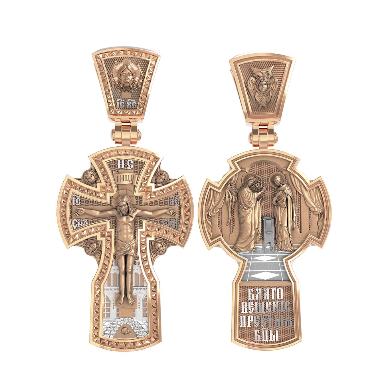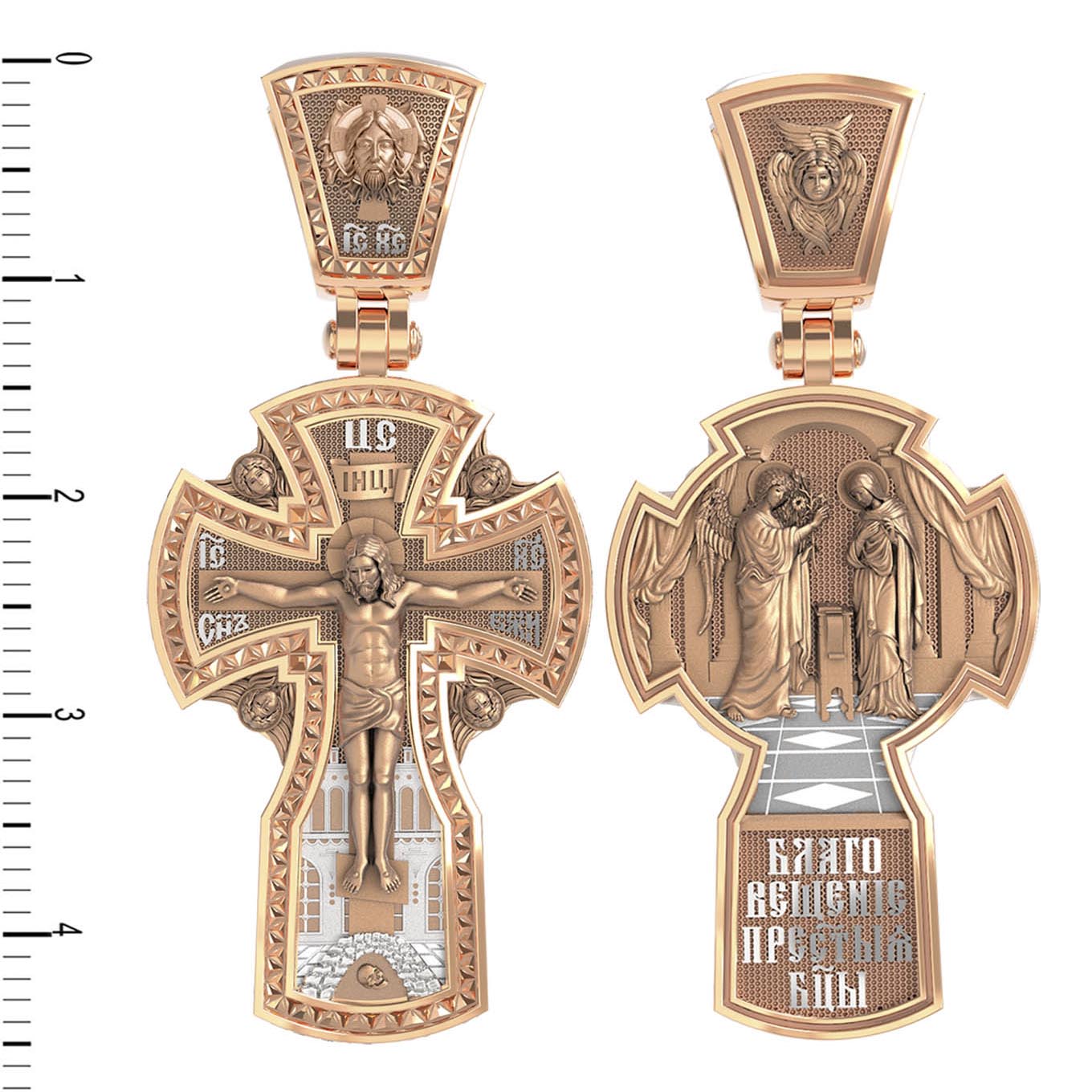 На оборотной стороне креста изображена икона «Благовещение Пресвятой Богородицы». Как нам повествует Священное Писание, Архангел Гавриил послан был от Бога в город Назарет к Пресвятой Деве Марии с радостной вестью, что Господь избрал Ее быть Матерью Спасителя мира. Ангел сказал: «Радуйся благодатная! Господь с Тобою! Благословенна Ты между женами». Мария cмутилась от слов Ангела и думала: что значит это приветствие? Ангел же продолжал говорить Ей: «не бойся, Мария, ибо Ты обрела благодать у Бога. И вот, Ты родишь Сына и наречешь имя Ему Иисус. Он будет велик, и назовется сыном Всевышнего, и Царству Его не будет конца…» На кулонном кольце изображен Ангел Серафим.