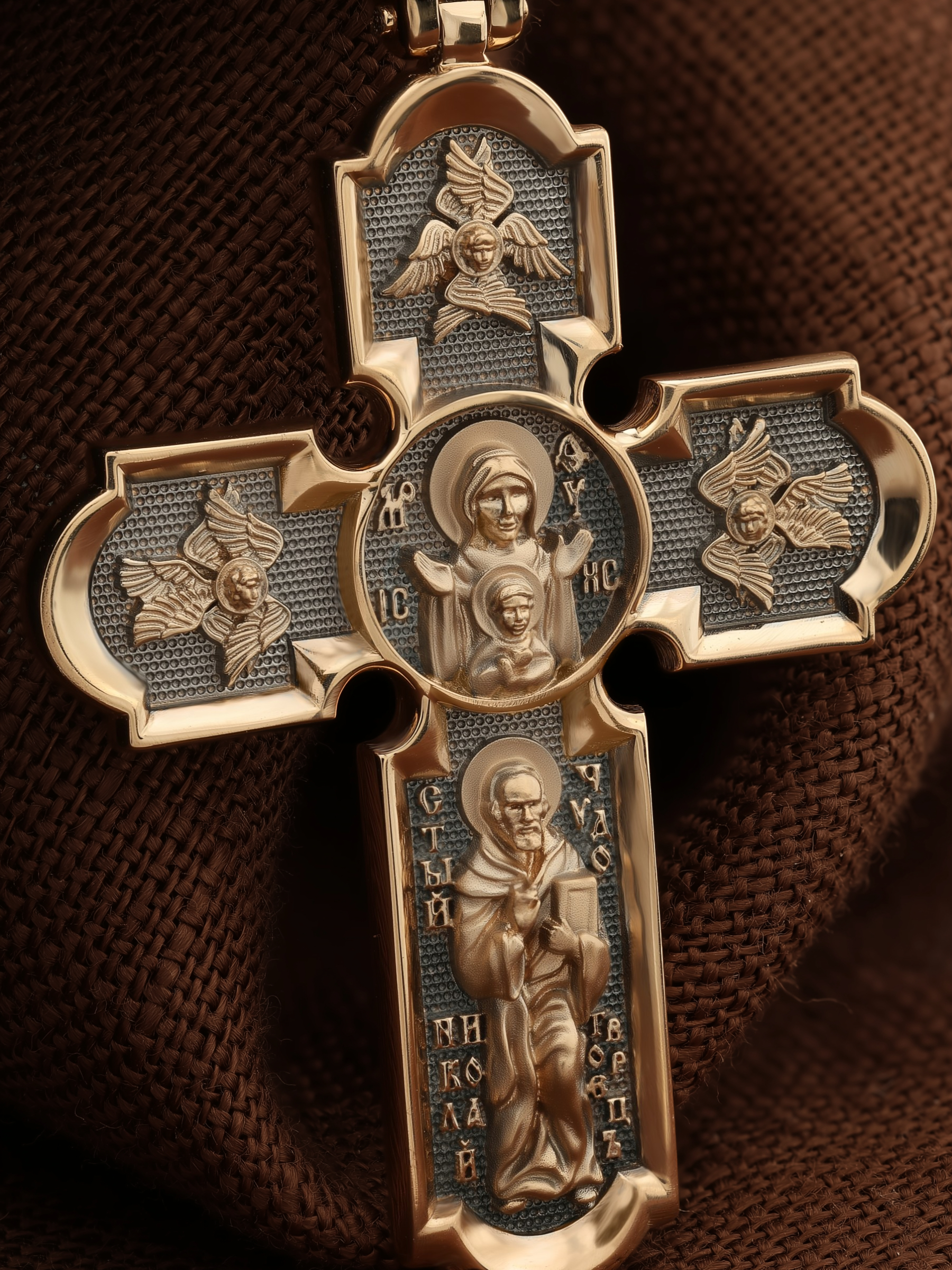 У основания креста в полный рост изображен самый любимый святой Православной Церкви — Николай Чудотворец. Святой почитается как целитель болезней, покровитель путешествующих, особенно по морю, помощник в торговле, учебе, а также в поисках достойного супруга.
