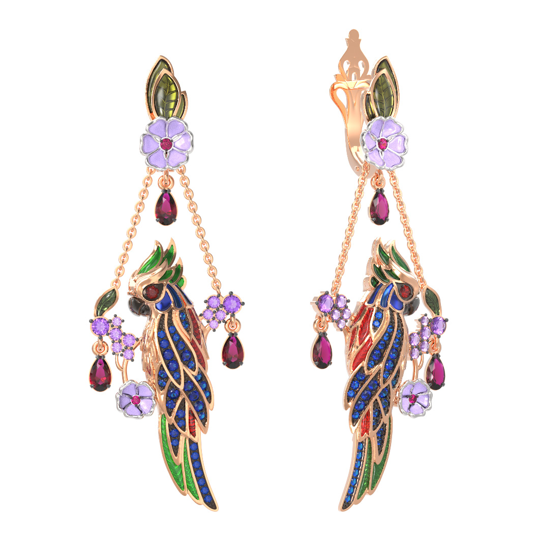 Серьги из золота c эмалью, аметистом, рубином, аметистом и сапфиром