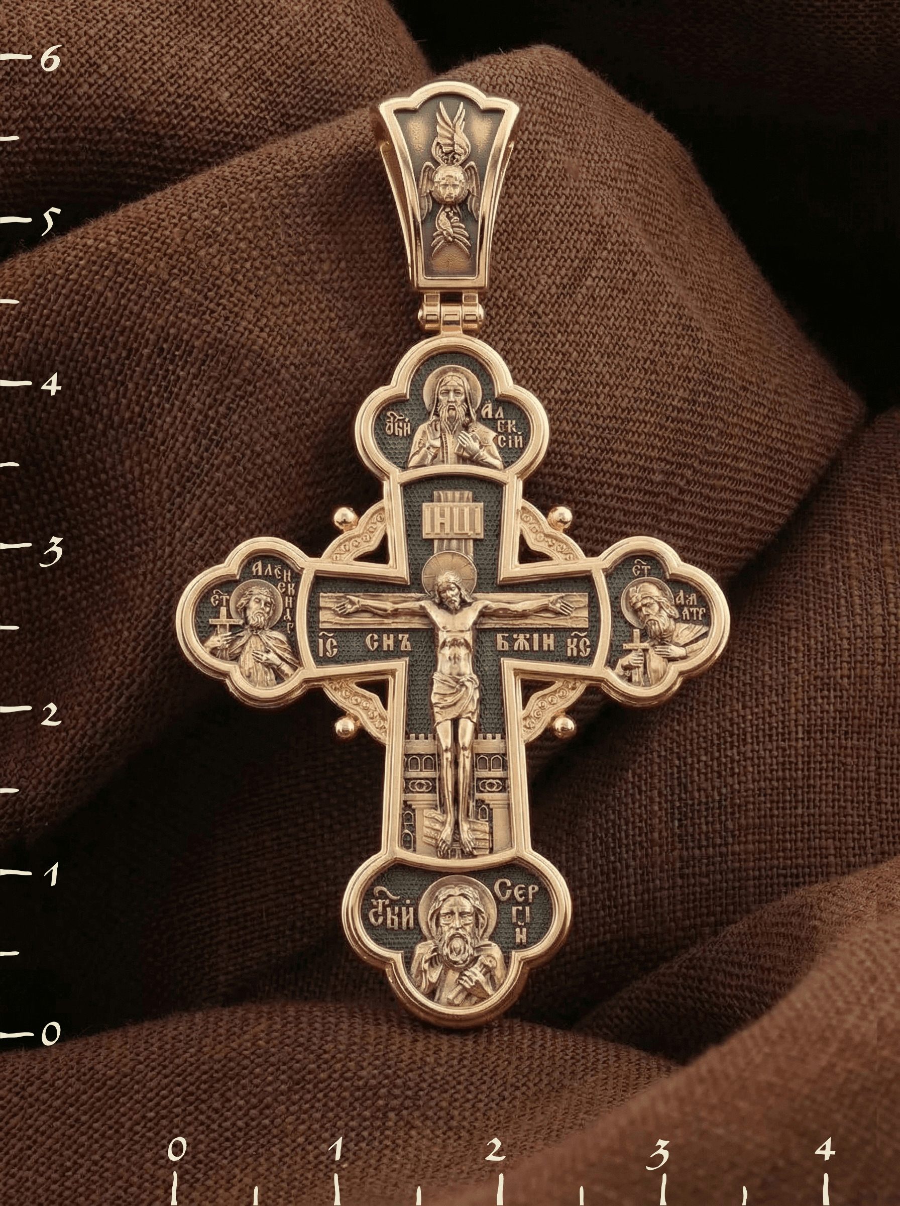 На лицевой стороне креста в центре изображено Распятие Господа Иисуса Христа. Слева от Господа находится святой благоверный князь Александр Невский, справа — святой благоверный князь Димитрий Донской. Святые князья почитаются как покровители воинов и защитники от врагов телесных и душевных. Вверху и над Распятием — образ митрополита московского святителя Алексия. Он почитается как помощник в воспитании детей и целитель, особенно при болезни глаз. Внизу — икона преподобного Сергия Радонежского, великого чудотворца и целителя. К нему обращаются в различных болезнях, тяжелых жизненных ситуациях, а также когда у детей возникают сложности в обучении.