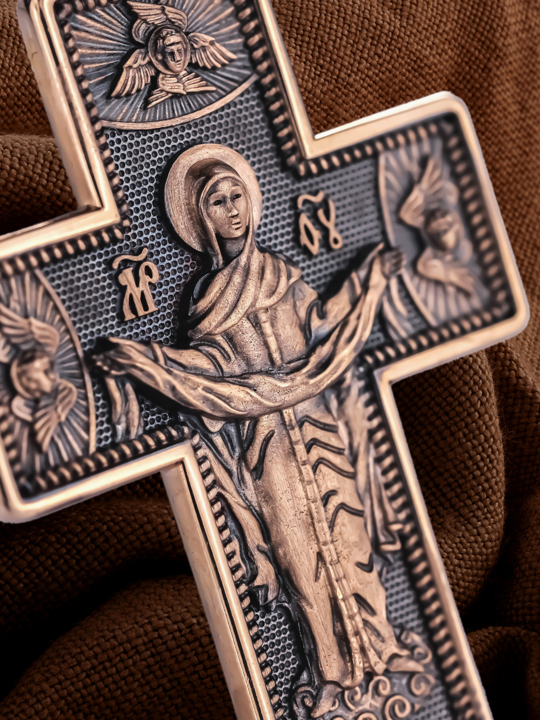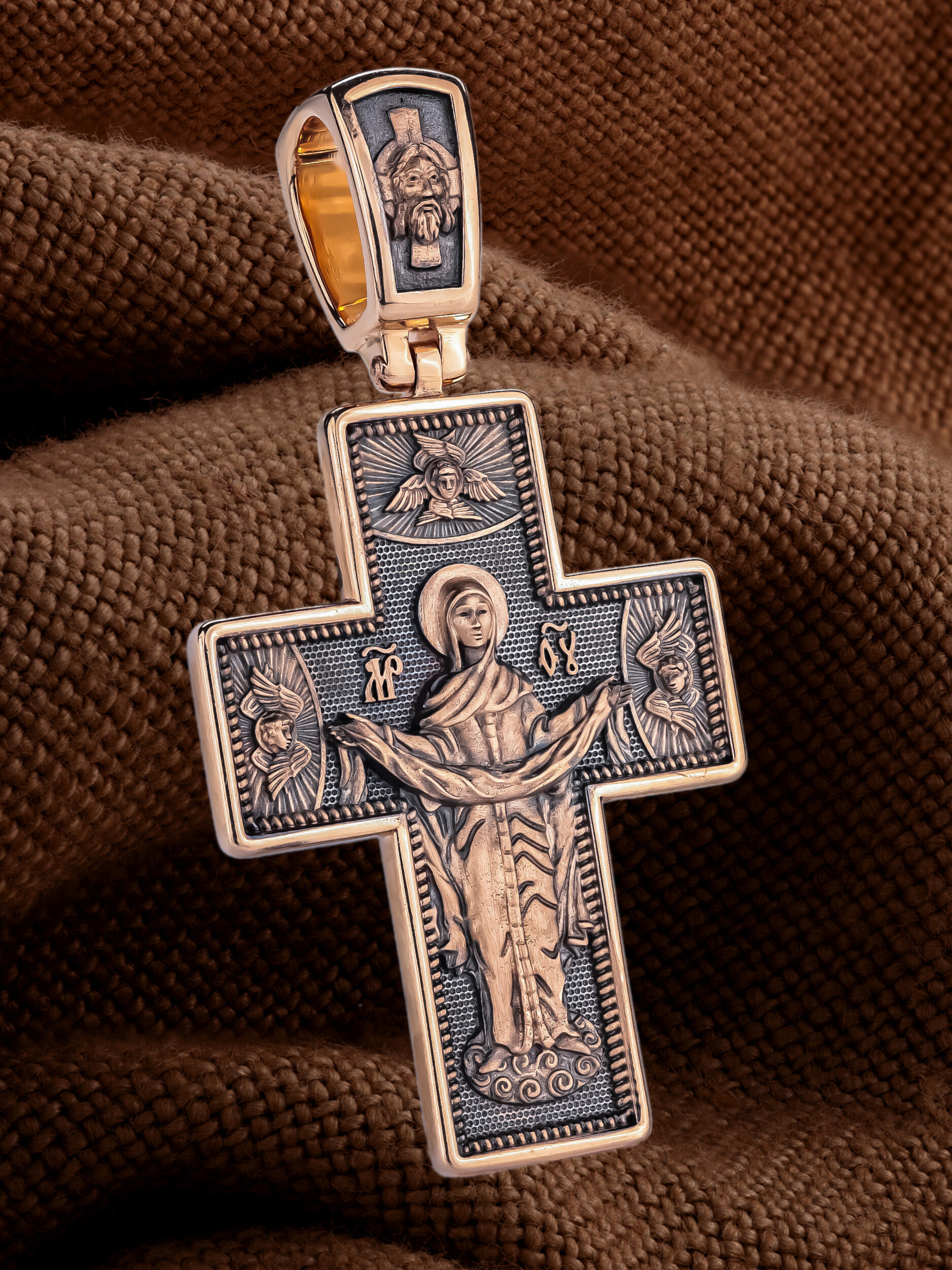 На обороте креста, в окружении крылатых Серафимов, изображена икона Покрова Пресвятой Богородицы. Праздник Покрова Божией Матери является воспоминанием чуда, которое произошло во Влахнернской церкви 1 (14) октября 910 года: Пресвятая Богородица явилась верующим над алтарем храма и распростерла над ними Свое покрывало. В этот день Божья Матерь открыла людям, что Она является Ходатаицей за них перед Богом. Богородица простирает Свой молитвенный покров над всеми православными христианами и умоляет Сына Своего о даровании вечного спасения каждому человеку.