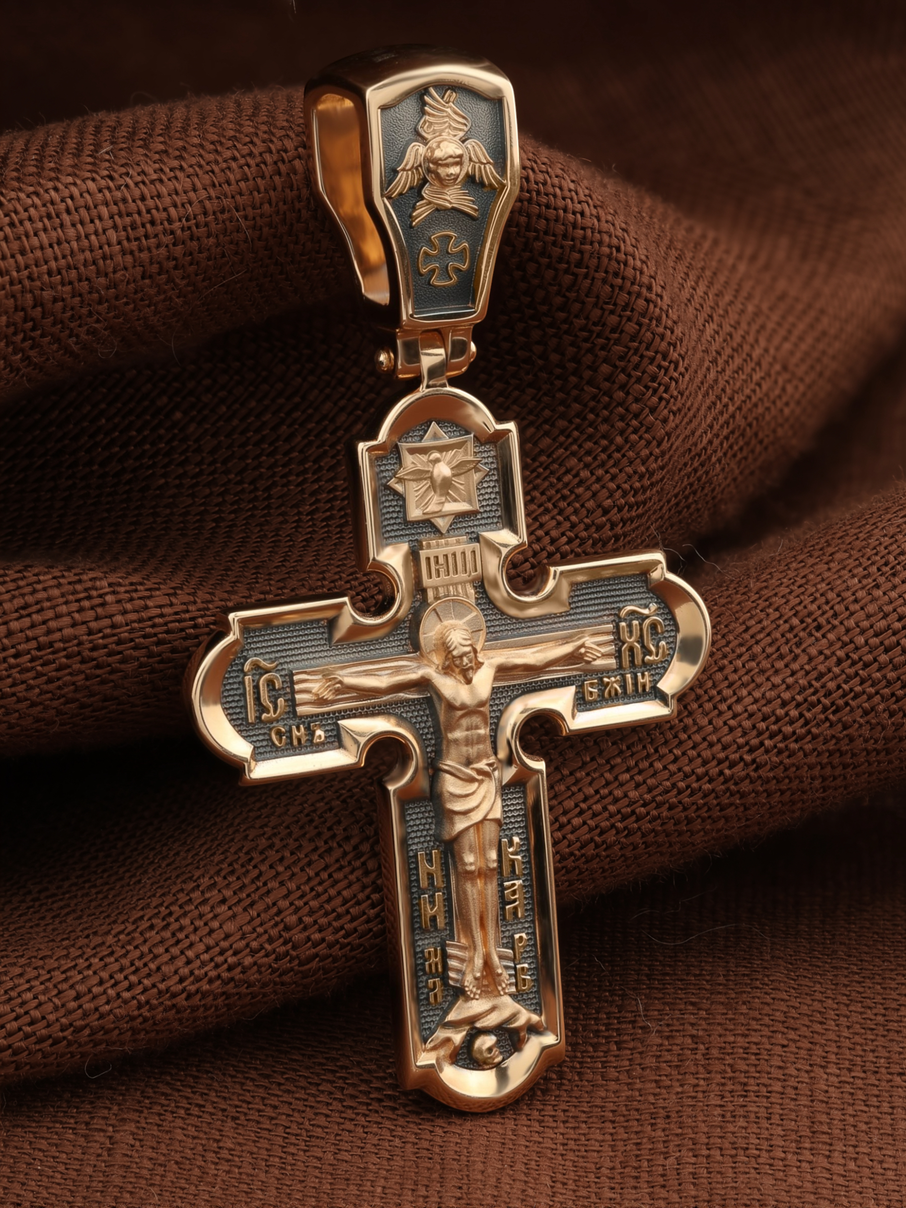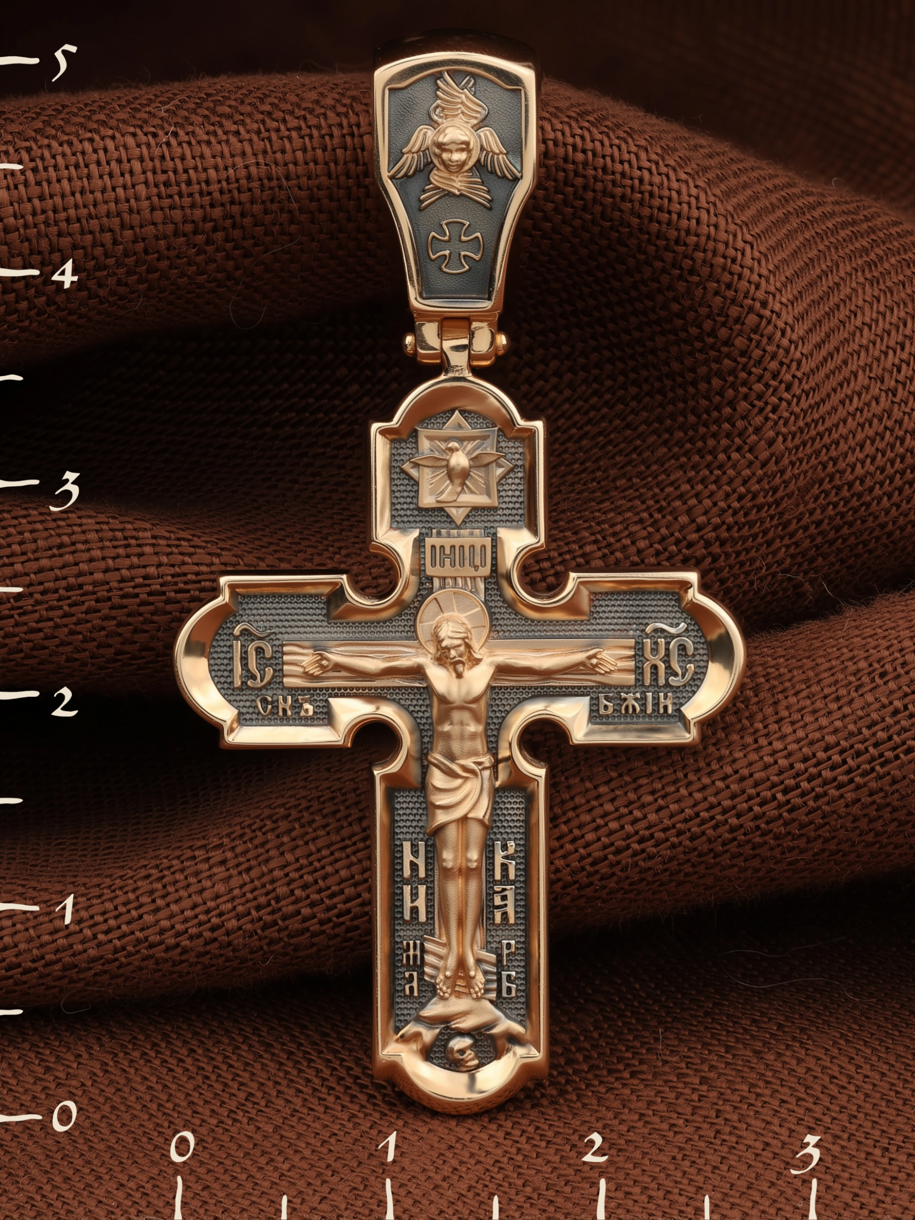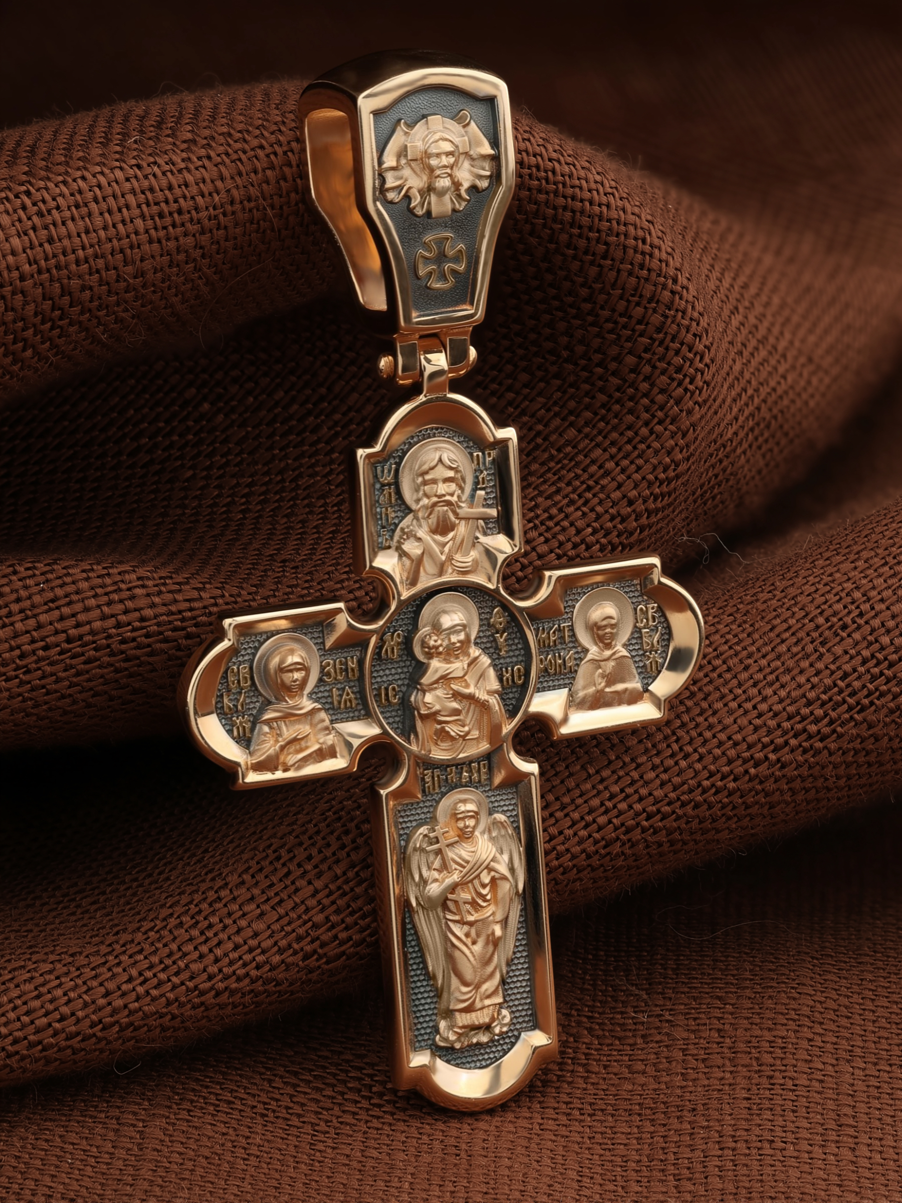 На кресте внизу изображен Ангел Хранитель, слева — Святая Блаженная Ксения, справа — Святая Блаженная Матрона, вверху — пророк, почитающийся в христианстве, Предтеча Господень Иоанн Креститель. На кулонном кольце помещено изображение Спаса Нерукотворного — образ Спасителя, который Он запечатлел на плате и передал для исцеления больному проказой царю Эдессы. Ему придается победное и защитное значение.