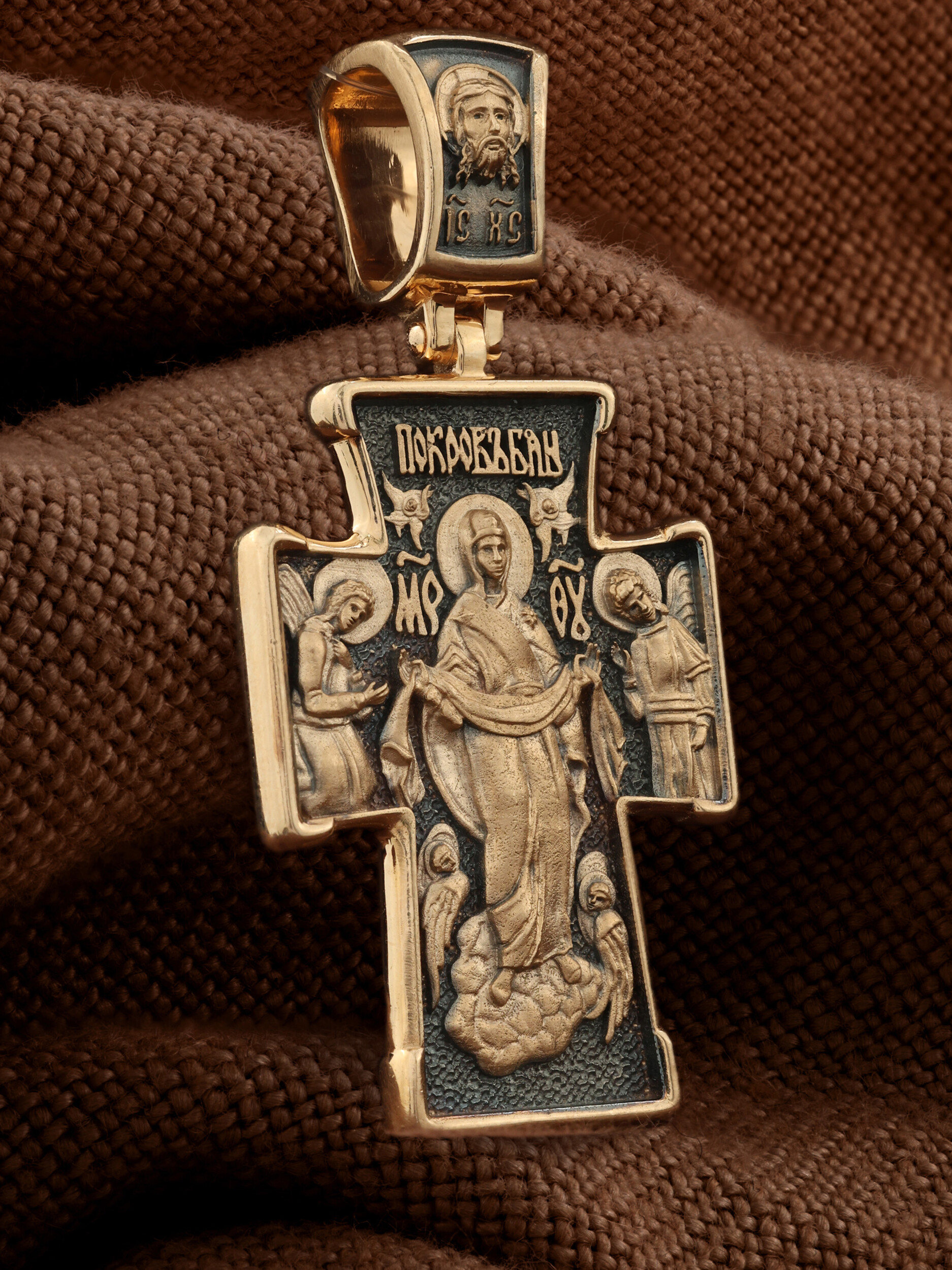 На обороте креста изображена икона Покрова Пресвятой Богородицы. Праздник Покрова Божией Матери является воспоминанием чуда, которое произошло во Влахнернской церкви 1 (14) октября 910 года: Пресвятая Богородица явилась верующим над алтарем храма и распростерла над ними Свое покрывало. В этот день Божия Матерь открыла людям, что Она является Ходатаицей за них перед Богом. Богородица простирает Свой молитвенный покров над всеми православными христианами и умоляет Сына Своего о даровании вечного спасения каждому человеку.