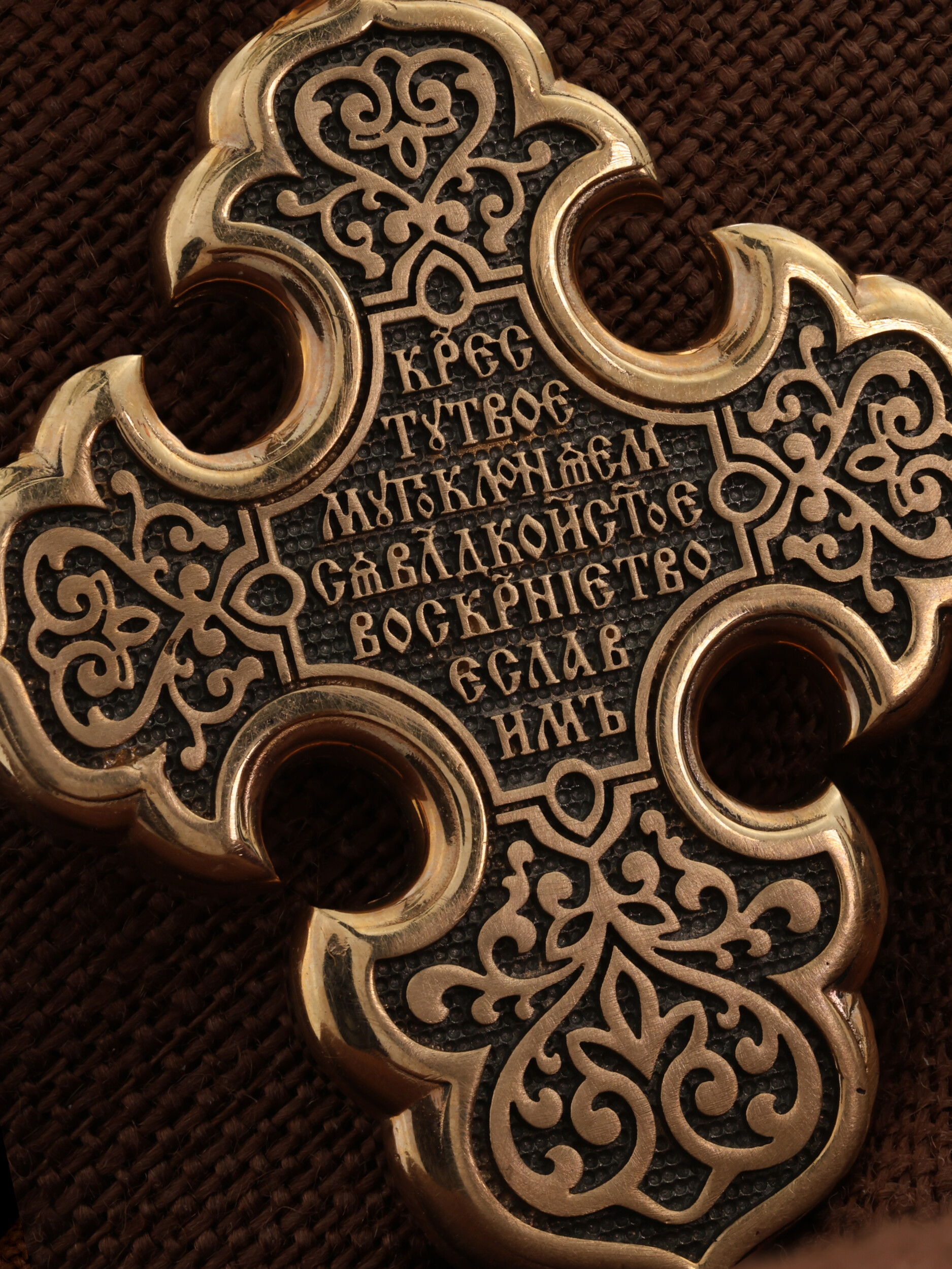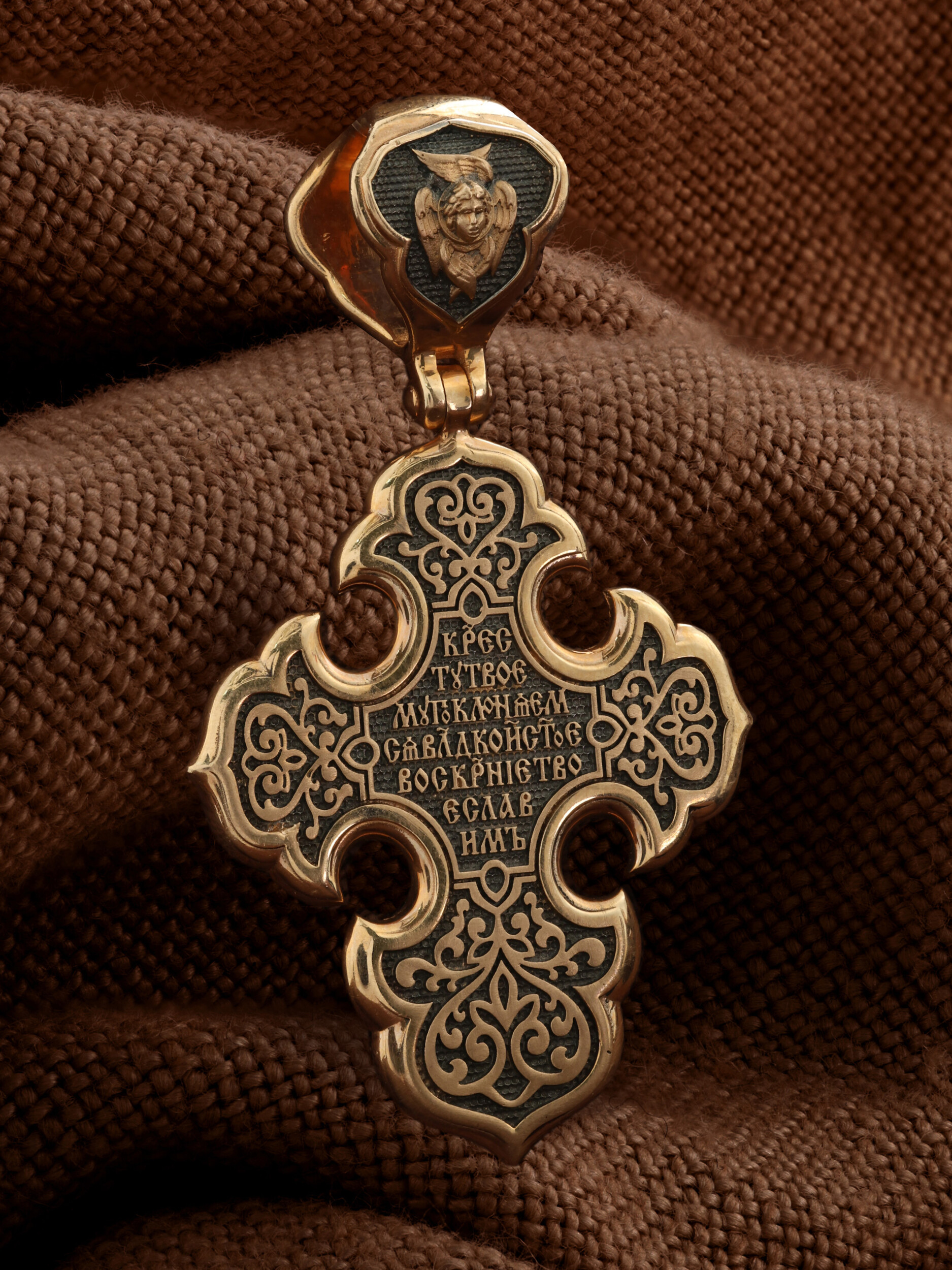 На оборотной стороне креста написана песнь: «Кресту Твоему поклоняемся, Владыко, и святое Воскресение Твое славим». На кулонном кольце изображен Ангел Серафим.