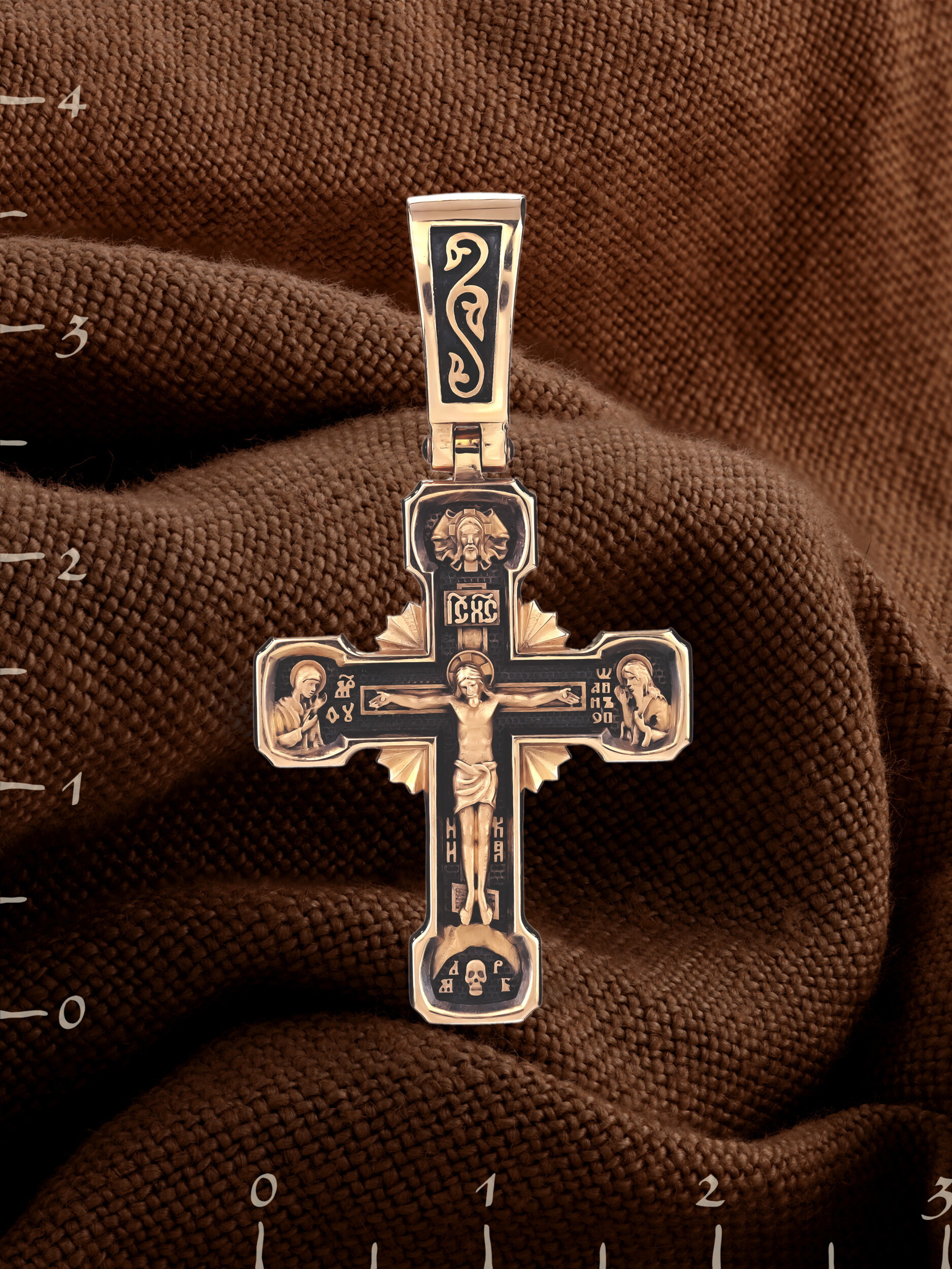 На лицевой стороне креста изображено Распятие Господа Иисуса Христа. Верхняя перекладина символизирует собой табличку с надписью «IHЦI» — Иисус Назарянин Царь Иудейский. Ниже перекладины добавляется: «НИКА» (греч. — Победитель). Возвышение, на котором стоит Крест, символизирует гору Голгофу, на которой произошло Распятие. У подножия Креста изображают прах Адама, обозначенный черепом.