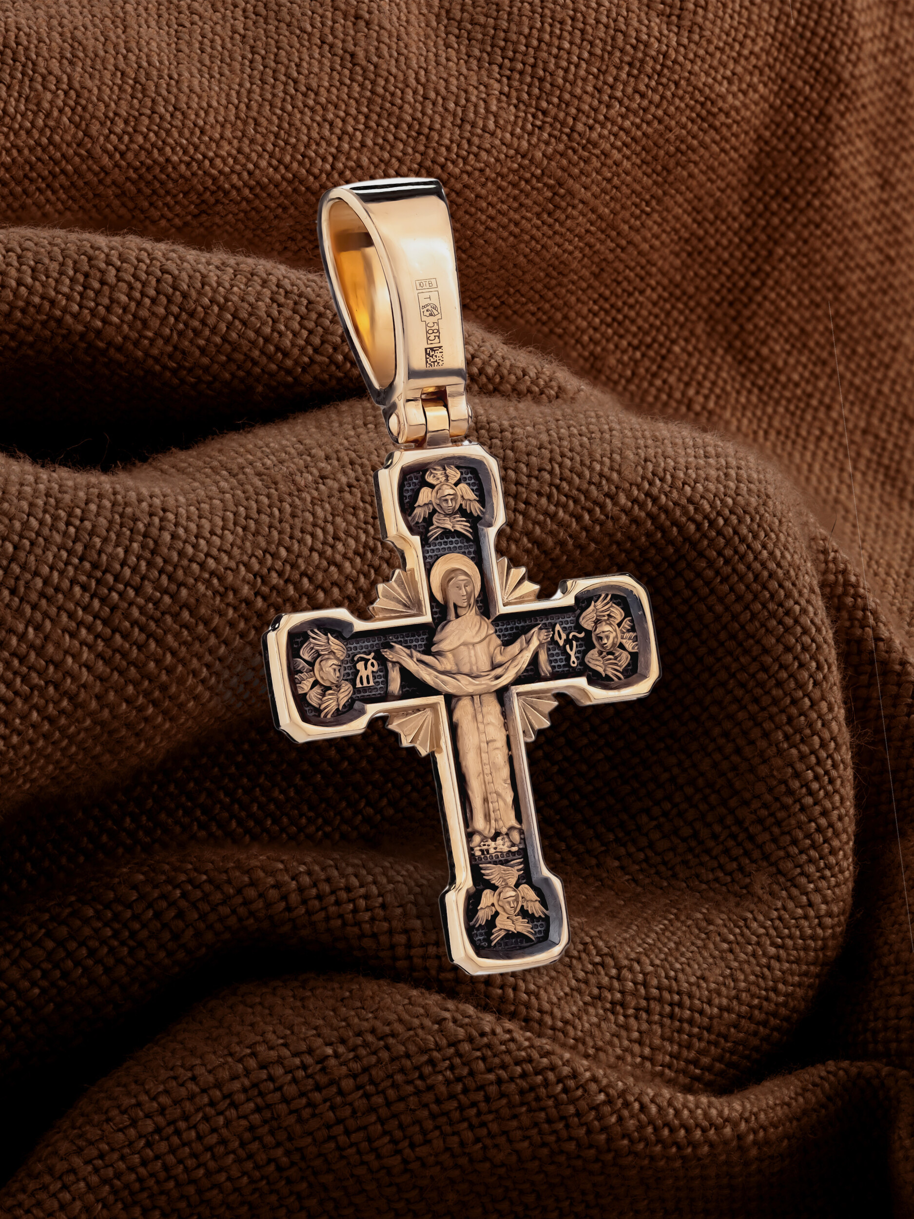 На обороте креста изображена икона Покрова Пресвятой Богородицы. Праздник Покрова Божией Матери является воспоминанием чуда, которое произошло во Влахнернской церкви 1 (14) октября 910 года: Пресвятая Богородица явилась верующим над алтарем храма и распростерла над ними Свое покрывало. В этот день Божья Матерь открыла людям, что Она является Ходатаицей за них перед Богом. Икону окружают шестикрылые Серафимы — самые приближенные к Господу Ангелы. Над иконой Богородицы изображен Спас Нерукотворный — Символ вочеловечившегося Божества.