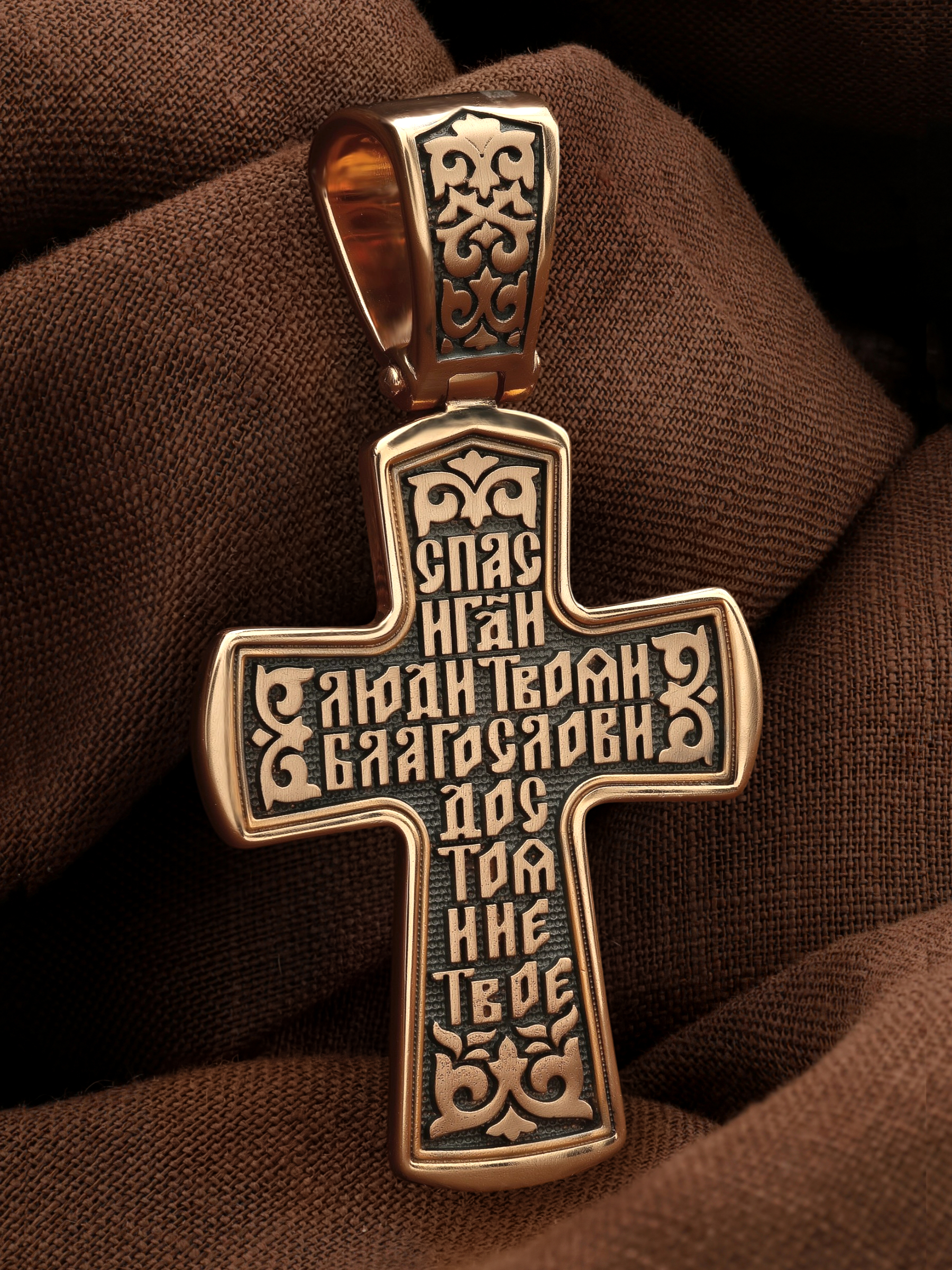 На оборотной стороне креста написан начальный стих тропаря Животворящему Кресту Господню: «Спаси, Господи, люди Твоя и благослови достояние твое…».