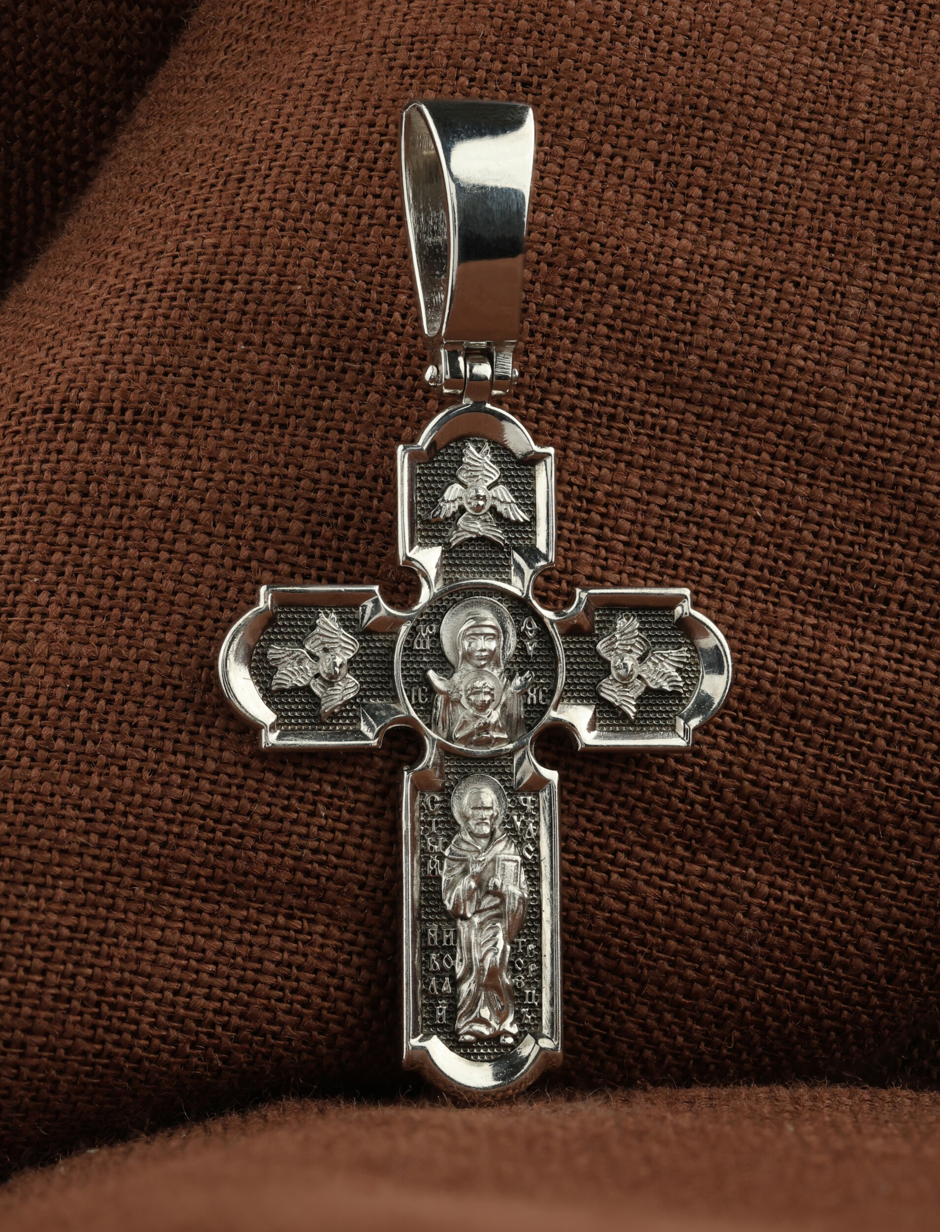 У основания креста в полный рост изображен самый любимый святой Православной Церкви — Николай Чудотворец. Святой почитается как целитель болезней, покровитель путешествующих, особенно по морю, помощник в торговле, учебе, а также в поисках достойного супруга.