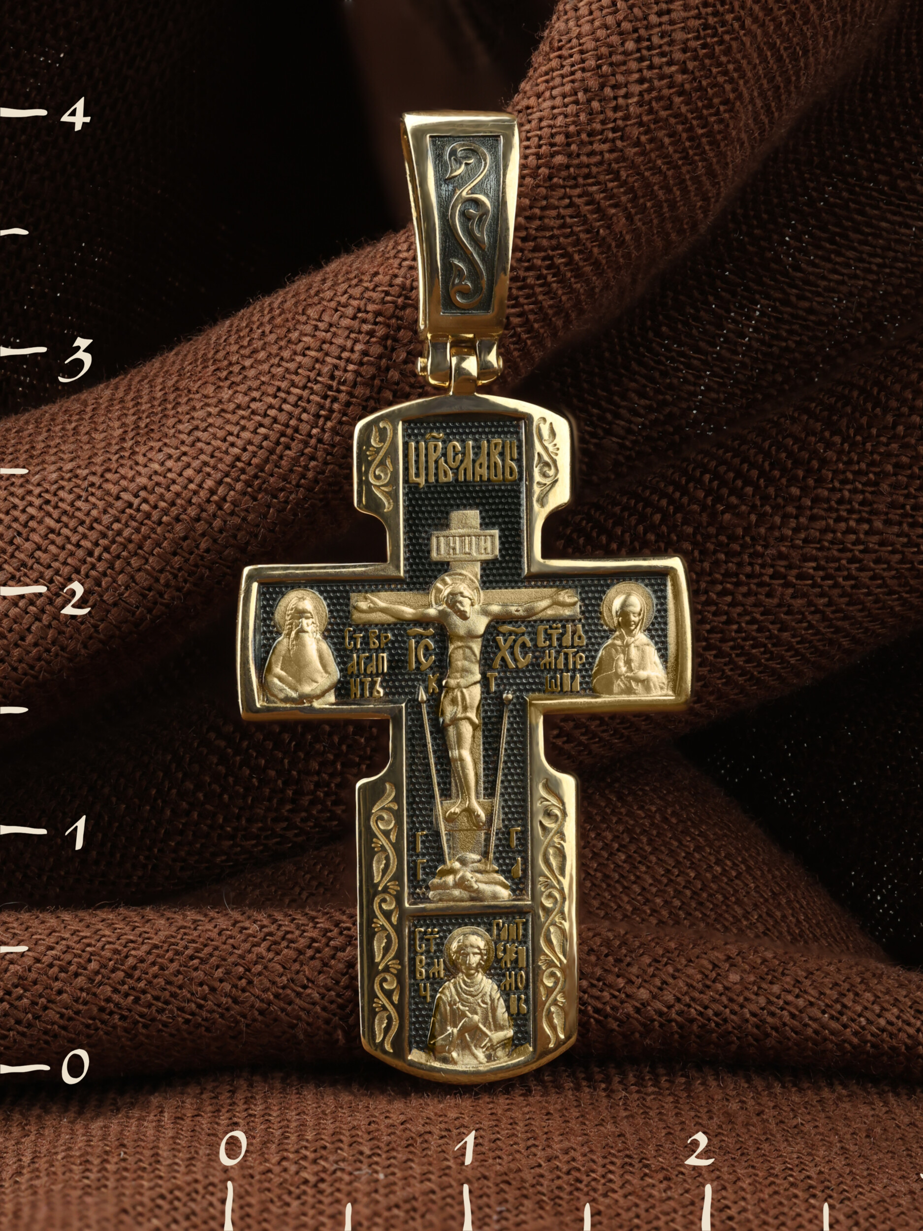 Как действенная помощь в немощах и болезнях был создан крест с образами святых целителей и со знаменитой афонской иконой Божией Матери «Всецарица». На лицевой стороне креста изображено Распятие Иисуса Христа. Над титлом видим слова «ЦРЬ СЛВЫ» — Царь Славы. Верхняя перекладина символизирует собой табличку с надписью «IHЦI» — Иисус Назарянин Царь Иудейский. Под перекладиной пишется сокращенно имя Спасителя «IC XC» — Иисус Христос. Возвышение, на котором стоит Крест, символизирует гору Голгофу, на которой произошло Распятие. У подножия Креста изображают прах Адама, обозначенный черепом. Справа от Распятия помещен образ прославленной святой блаженной Матроны. Слева — икона Преподобный Агапита. Этот святой жил в пещерах Киево-Печерского монастыря в XI веке и бескорыстно врачевал мирян и монахов. У основания Креста Господня изображен великомученик Пантелеимон Целитель. Господь даровал удивительную силу его молитве. Ею он исцелял любые болезни и даже воскрешал умерших.