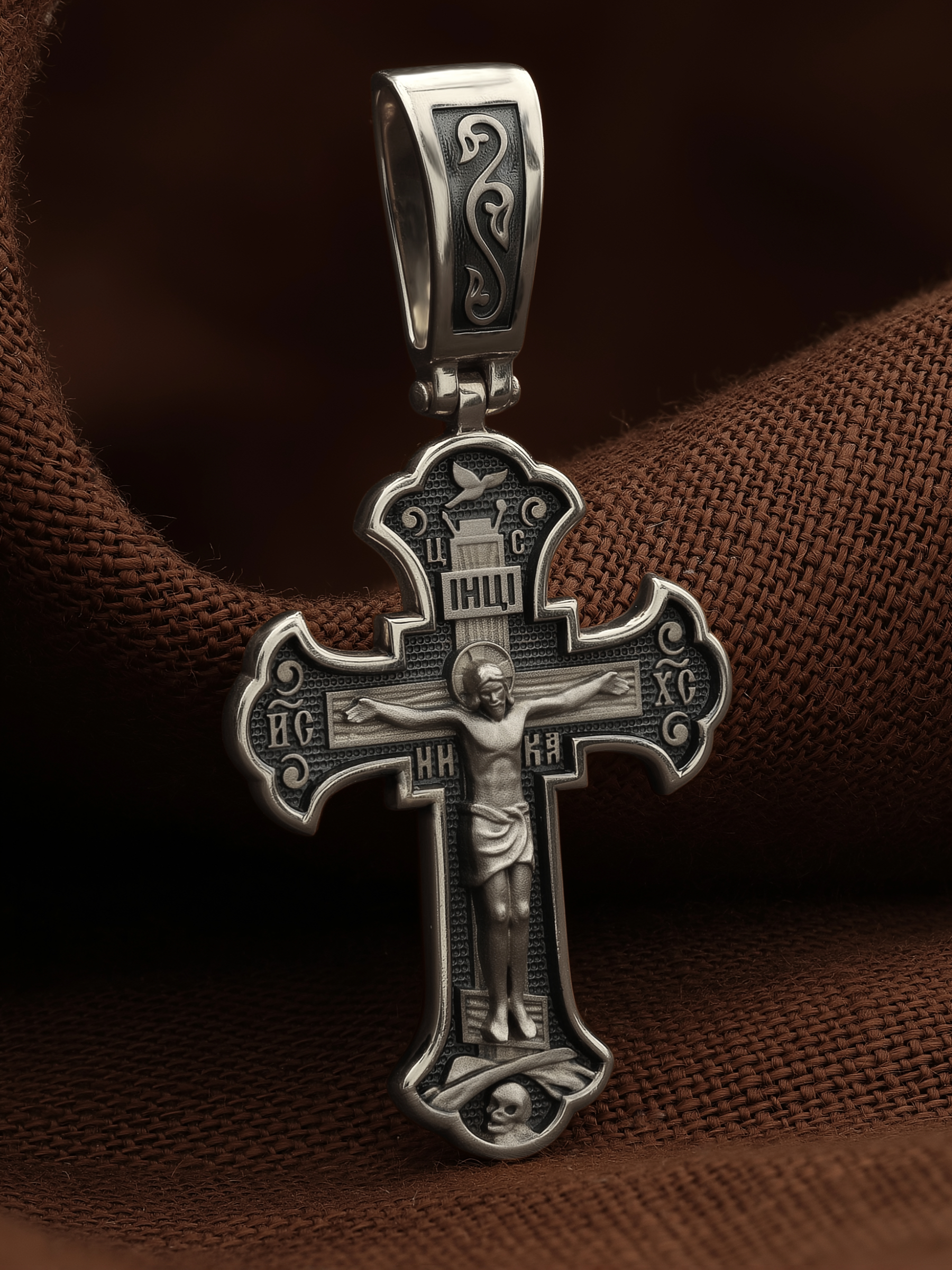 На лицевой стороне креста изображено Распятие, потому что это орудие казни Иисус Христос сделал орудием победы над грехом и смертью. Своими страданиями Он искупил грехи человечества, умерев и сошествовав во ад, победил сатану, освободил души праведников от вечной смерти и открыл им небесные врата рая. Жертва Христа сделала возможным спасение для каждого человека. На православном кресте Христос не умирает, а свободно простирает руки, ладони Иисуса открыты, будто он хочет обнять все человечество, даря им свою любовь и открывая путь к вечной жизни.