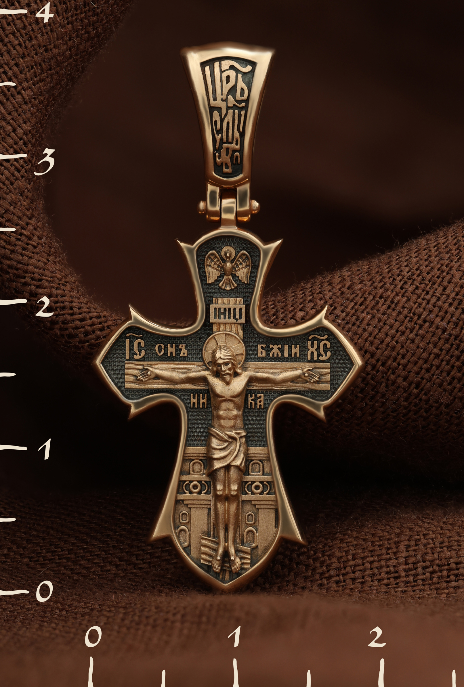 На лицевой стороне креста изображено распятие Господа нашего Иисуса Христа. Позади Распятия видна иерусалимская стена, знак того, что Господь был распят вне стен города. Но вместе с тем стена символизирует и Небесный Иерусалим, путь который открылся для человека через Голгофу. На кулоном кольце видим слова «ЦРЬ СЛВЫ» — Царь Славы. Верхняя перекладина символизирует собой табличку с надписью «IHЦI» — Иисус Назарянин Царь Иудейский. Над перекладиной пишется сокращенно имя Спасителя «IC XC» — Иисус Христос и словосочетание «СНЪ БЖIЙ» — «СЫН БОЖИЙ». Рядом с образом Христа помещены слова — «НИКА» (греч. — Победитель). Возвышение, на котором стоит Крест, символизирует гору Голгофу, на которой произошло Распятие. У подножия Креста изображают прах Адама, обозначенный черепом.