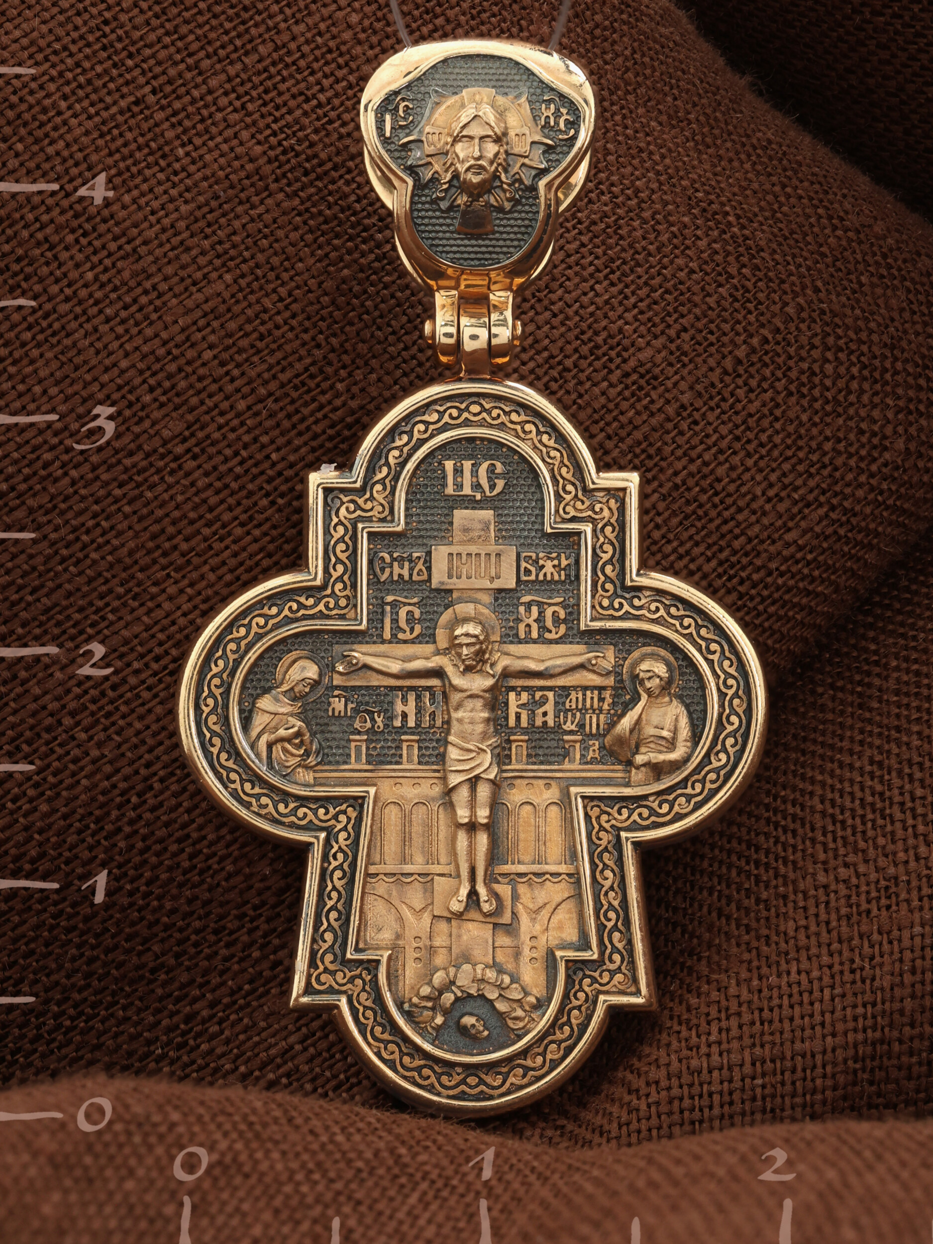 На лицевой стороне креста изображено Распятие Господа и Спасителя нашего Иисуса Христа, отдавшего Себя на смерть, для искупления грехов мира. Крест является символом жертвенной любви Всеблагого Бога к падшим людям, всепобеждающим духовным оружием христиан, основанием и средоточием церковной жизни. Господь сказал: кто хочет идти за Мною, отвергнись себя, и возьми крест свой, и следуй за Мною. (Мк. 8: 34). Над Распятием помещена надпись «Царь Славы». На верхней табличке, выше головы Иисуса, расположена надпись, составленная Понтием Пилатом — «IНЦI». Она означает «Иисус Назорей, Царь Иудейский». Надпись «IC» «ХC», означает Иисус Христос, помещается на разных сторонах поперечной перекладины креста. Возвышение, на котором стоит Крест, символизирует гору Голгофу, на которой произошло Распятие. Под подножием Креста изображена покоящаяся голова (череп) Адама. На кулонном кольце изображен Нерукотворный образ Господа и Спасителя нашего Иисуса Христа, чудесно отпечатавшийся на плате, которым Христос вытер свой лик.