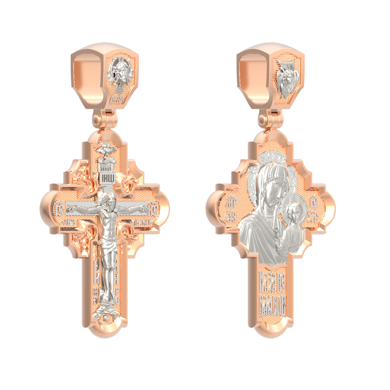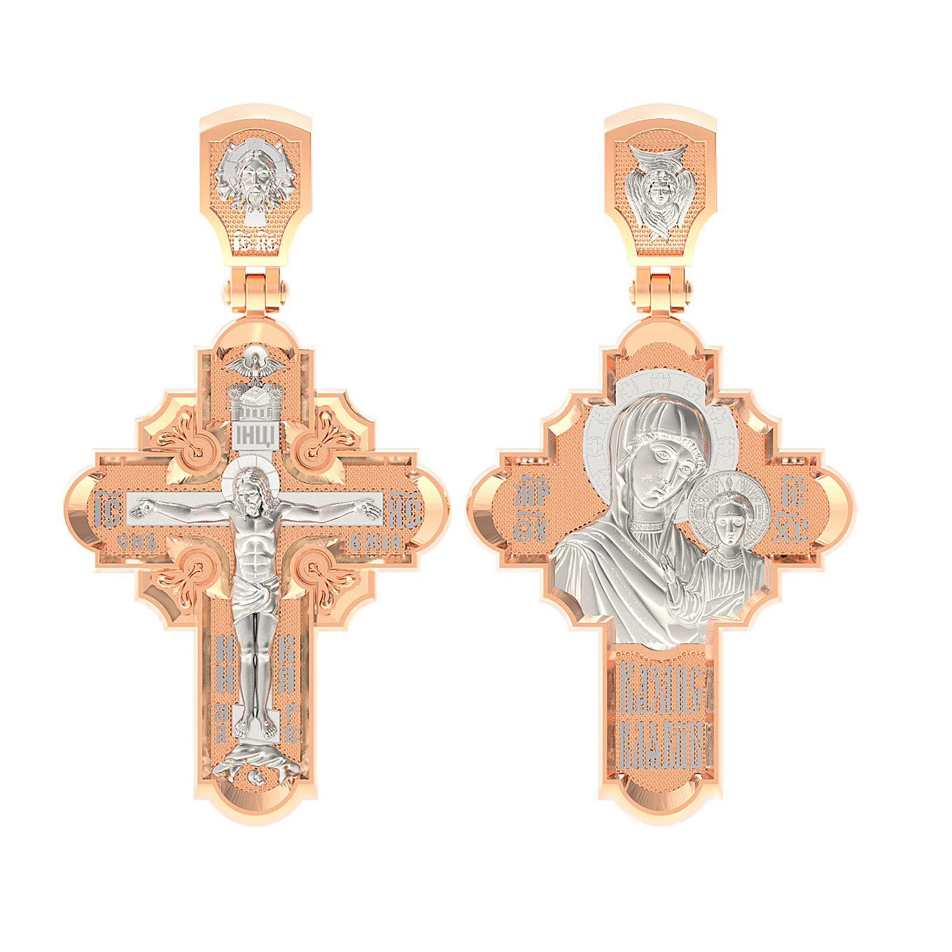 На оборотной стороне креста изображена Казанская икона Божией Матери. Пресвятая Богородица — милосердная заступница, просительница за нас перед Богом. Она стала воистину нашей Матушкой, охраняющей и поддерживающей нас от рождения до самой смерти, а Ее благодатная помощь изливается на нас по молитвам у ее чудотворных икон. Казанская икона явилась в 1579 году в Казани, вскоре после взятия Казанского царства у татар Иоанном Грозным. Этот образ Богородицы не раз сопровождал русский народ в бедствиях. Икона Божией Матери Казанская вдохновляла русских ратников в период Смутного времени при освобождении Москвы от поляков. Перед Казанской иконой в 1709 году, накануне Полтавской победы, император Петр I молился о даровании победы русскому войску. В 1812 году накануне отъезда в действующую армию перед чудотворной иконой Божией Матери молился князь Михаил Кутузов. Не только государственным мужам и дружинам указывала путь икона — по доброй традиции именно этой иконой благословляют на брак молодых родители, длинным списком чудес сопровождается этот образ Богоматери — один из самых любимых на Руси. Существует множество древних списков с этой удивительной иконы.