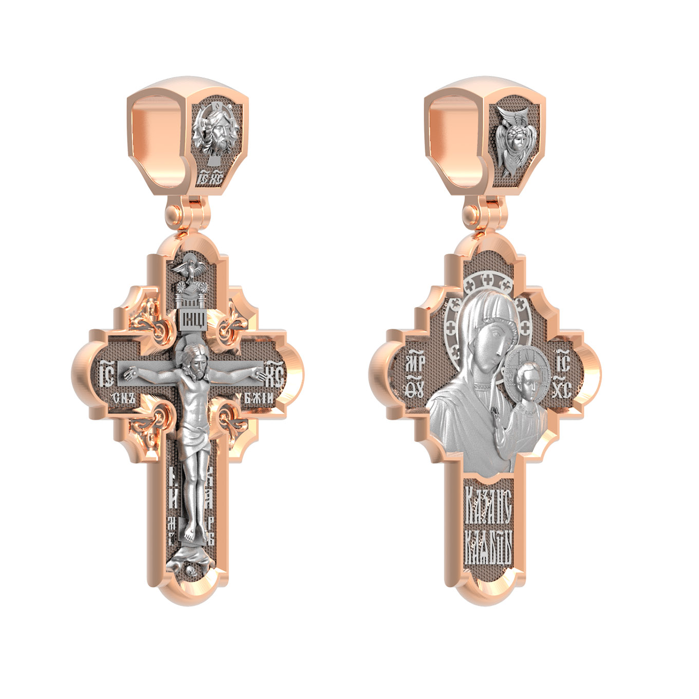 На оборотной стороне креста изображена Казанская икона Божией Матери. Пресвятая Богородица — милосердная заступница, просительница за нас перед Богом. Она стала воистину нашей Матушкой, охраняющей и поддерживающей нас от рождения до самой смерти, а Ее благодатная помощь изливается на нас по молитвам у ее чудотворных икон. Казанская икона явилась в 1579 году в Казани, вскоре после взятия Казанского царства у татар Иоанном Грозным. Этот образ Богородицы не раз сопровождал русский народ в бедствиях. Икона Божией Матери Казанская вдохновляла русских ратников в период Смутного времени при освобождении Москвы от поляков. Перед Казанской иконой в 1709 году, накануне Полтавской победы, император Петр I молился о даровании победы русскому войску. В 1812 году накануне отъезда в действующую армию перед чудотворной иконой Божией Матери молился князь Михаил Кутузов. Не только государственным мужам и дружинам указывала путь икона — по доброй традиции именно этой иконой благословляют на брак молодых родители, длинным списком чудес сопровождается этот образ Богоматери — один из самых любимых на Руси. Существует множество древних списков с этой удивительной иконы.