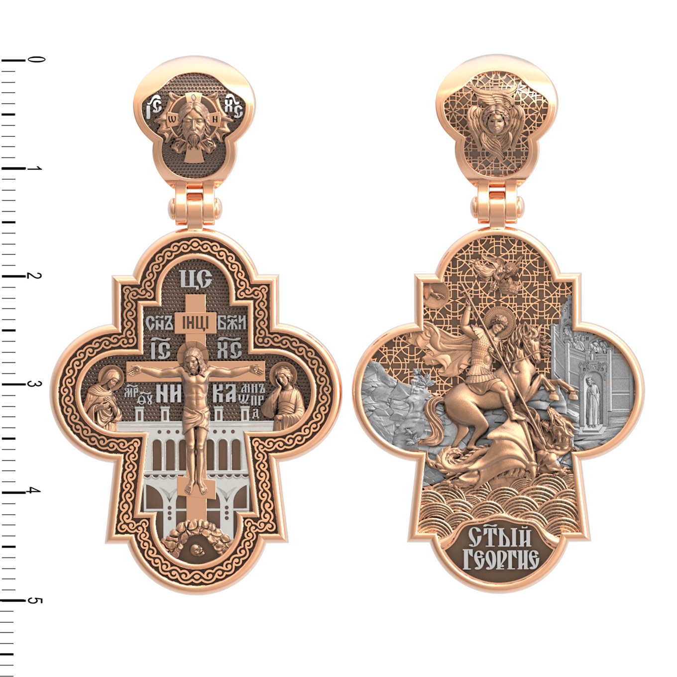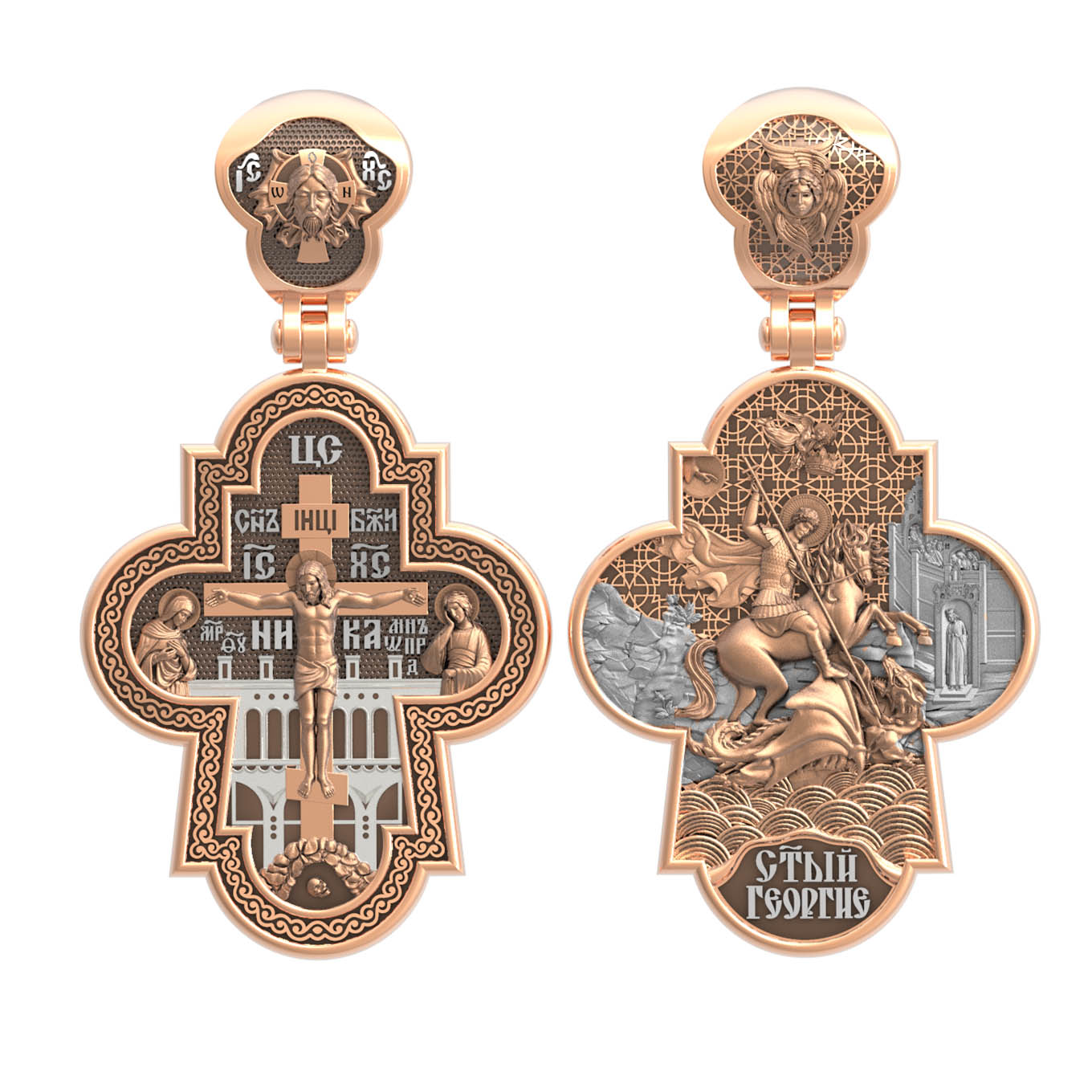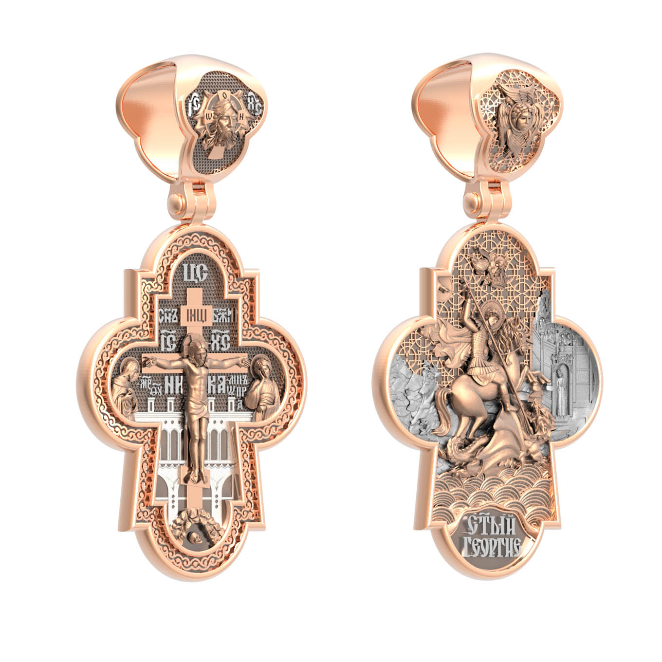 На оборотной стороне креста помещено изображение Святого Великомученика Георгия Победоносца — одного из самых почитаемых и удивительных святых. Георгий родился в Каппадокии (Малая Азия) в семье богатых и знатных горожан. Юношей поступил на службу к римскому императору Диоклетиану, за отличное знание военного дела и проявленную в боях и походах храбрость был приближен к императору и удостоен высокого воинского звания. Во время начавшихся гонений на христиан, перешел на сторону гонимых и, отвергнув человеческий страх, стал ярым проповедником учения Христа. Мучители подвергли опального воеводу жесточайшим восьмидневным пыткам и казнили его (обезглавили) в возрасте около тридцати лет в 303 году. Георгий изображен как воитель, сидящий на вздыбленном коне и поражающий копьем огнедышащего змея. Слева над образом изображена благословляющая Божия десница. Над святым изображен ангел возлагающий на него венец мученика. Змей символизирует собою сатанинские силы. Молитвами вознесенными к Всевышнему и своей непреклонной верой он смог одолеть чудовище. Святой убил змея, спас царскую дочь, принесенную в жертву, и жителей города, их души от влияния дьявола, породив в них надежду и веру в Господа, призывая людей принять христианскую веру. На кулонном кольце изображен шестикрылый Ангел — Серафим.