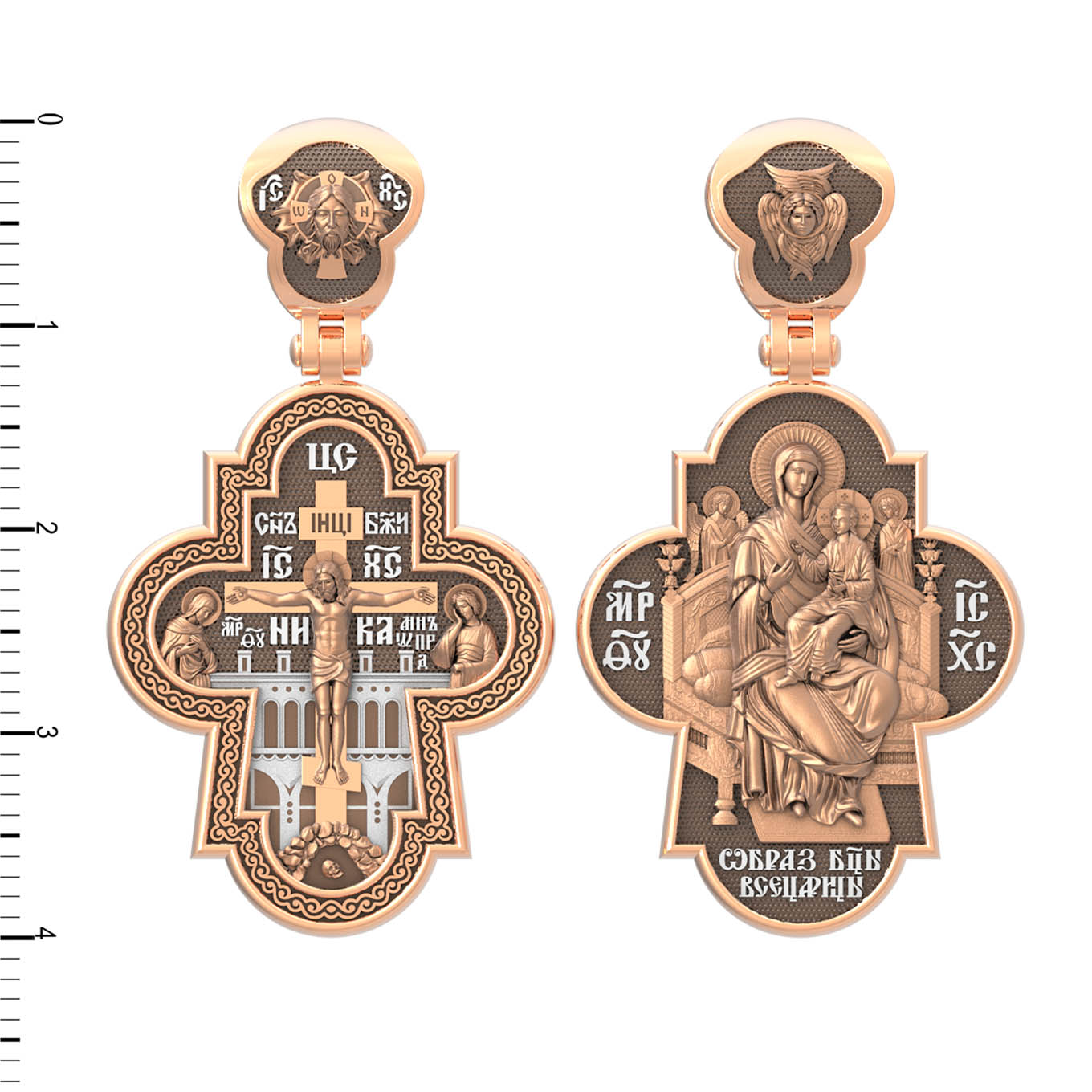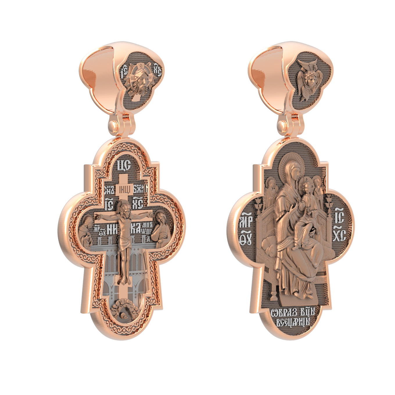 На оборотной стороне креста изображена икона Божией Матери «Всецарица» или «Пантанасса», на которой Пресвятая Богородица восседает на царском троне. На руках Ее — Богомладенец Христос со свитком в левой руке и благословляющий десницей. Правой рукой Богородица указывает на Своего Царственного Сына, как на Спасителя мира. Чудотворная икона была написана в XVII веке и находится на Святой Горе Афон, в одном из древних греческих монастырей — Ватопеде. По молитвам перед иконой совершается множество чудесных исцелений. Пречистая Богородица наставляет на праведный путь, помогает укрепить веру, найти утешение. На кулонном кольце изображен шестикрылый Серафим.