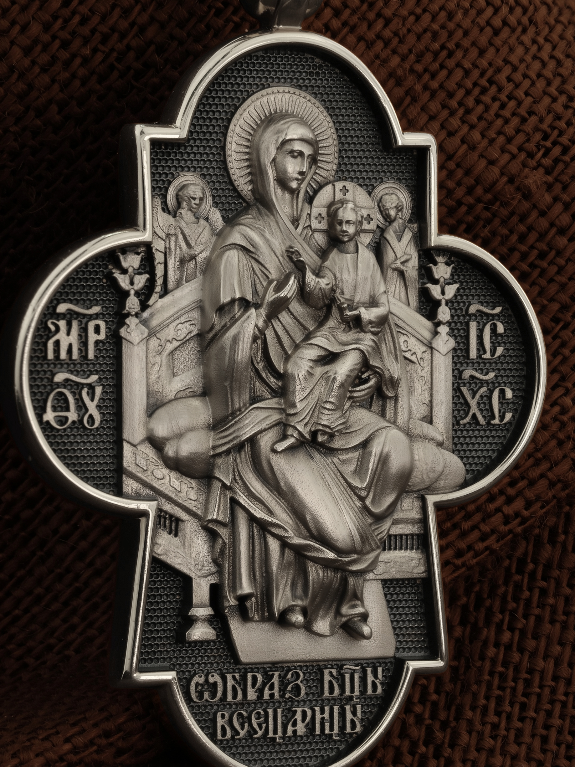 На оборотной стороне креста изображена икона Божией Матери «Всецарица» или «Пантанасса», на которой Пресвятая Богородица восседает на царском троне. На руках Ее — Богомладенец Христос со свитком в левой руке и благословляющий десницей. Правой рукой Богородица указывает на Своего Царственного Сына, как на Спасителя мира. Чудотворная икона была написана в XVII веке и находится на Святой Горе Афон, в одном из древних греческих монастырей — Ватопеде. По молитвам перед иконой совершается множество чудесных исцелений. Пречистая Богородица наставляет на праведный путь, помогает укрепить веру, найти утешение. На кулонном кольце изображен шестикрылый Серафим.