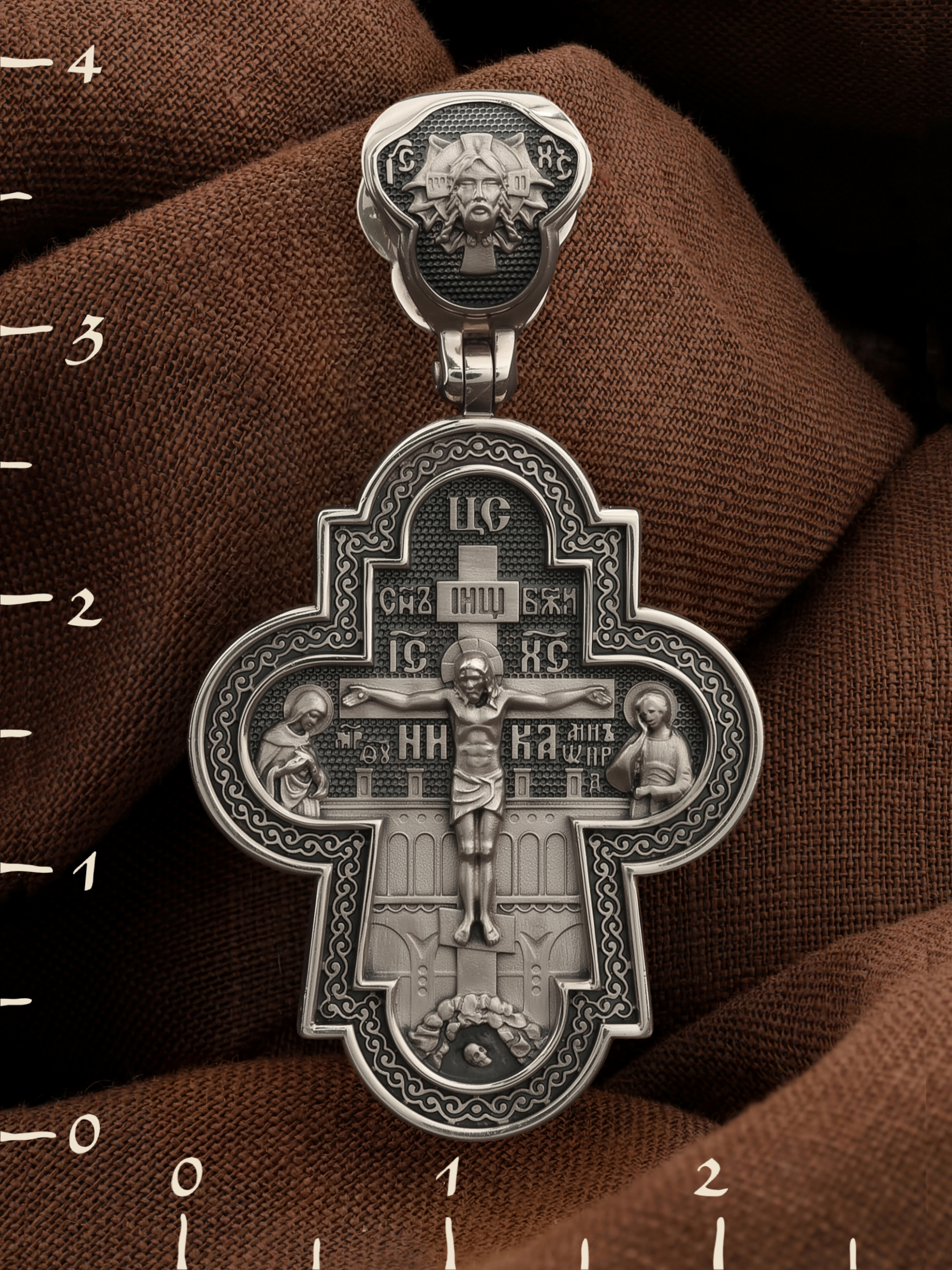 На лицевой стороне креста изображено Распятие Господа и Спасителя нашего Иисуса Христа, отдавшего Себя на смерть, чтобы другие могли жить — жить вечной жизнью, жить с Богом. Через крестную жертву Бог раскрывает нам Свою безмерную любовь и призывает к ответной любви. Своею кровью Господь освятил крест и сделал его проводником Своей благодати, источником освящения верующих. На верхней табличке, выше головы Иисуса, расположена надпись, составленная Понтием Пилатом — «IНЦI». Она означает «Иисус Назорей, Царь Иудейский». Распятие сопровождается каноническими надписями. Над Распятием находится надпись «Царь Славы». Надпись «IС» « ХС» означает Иисус Христос и помещается на разных сторонах поперечной (большой) перекладины креста. Рядом расположены надпись «Сын Божий» и слово «НИКА», что означает «победитель». Слева от Распятия изображена Пресвятая Богородица, справа — апостол и евангелист Иоанн Богослов, один из ближайших учеников Иисуса Христа. За Распятием высится Иерусалимская стена, в знак того, что Господь был распят вне стен города. Возвышение, на котором стоит Крест, символизирует гору Голгофу, на которой произошло Распятие. Под подножием Креста изображена покоящаяся голова (череп) Адама. Над На кулонном кольце изображен Нерукотворный образ Господа и Спасителя нашего Иисуса Христа, чудесно отпечатавшийся на плате, котором Христос вытер свой лик.