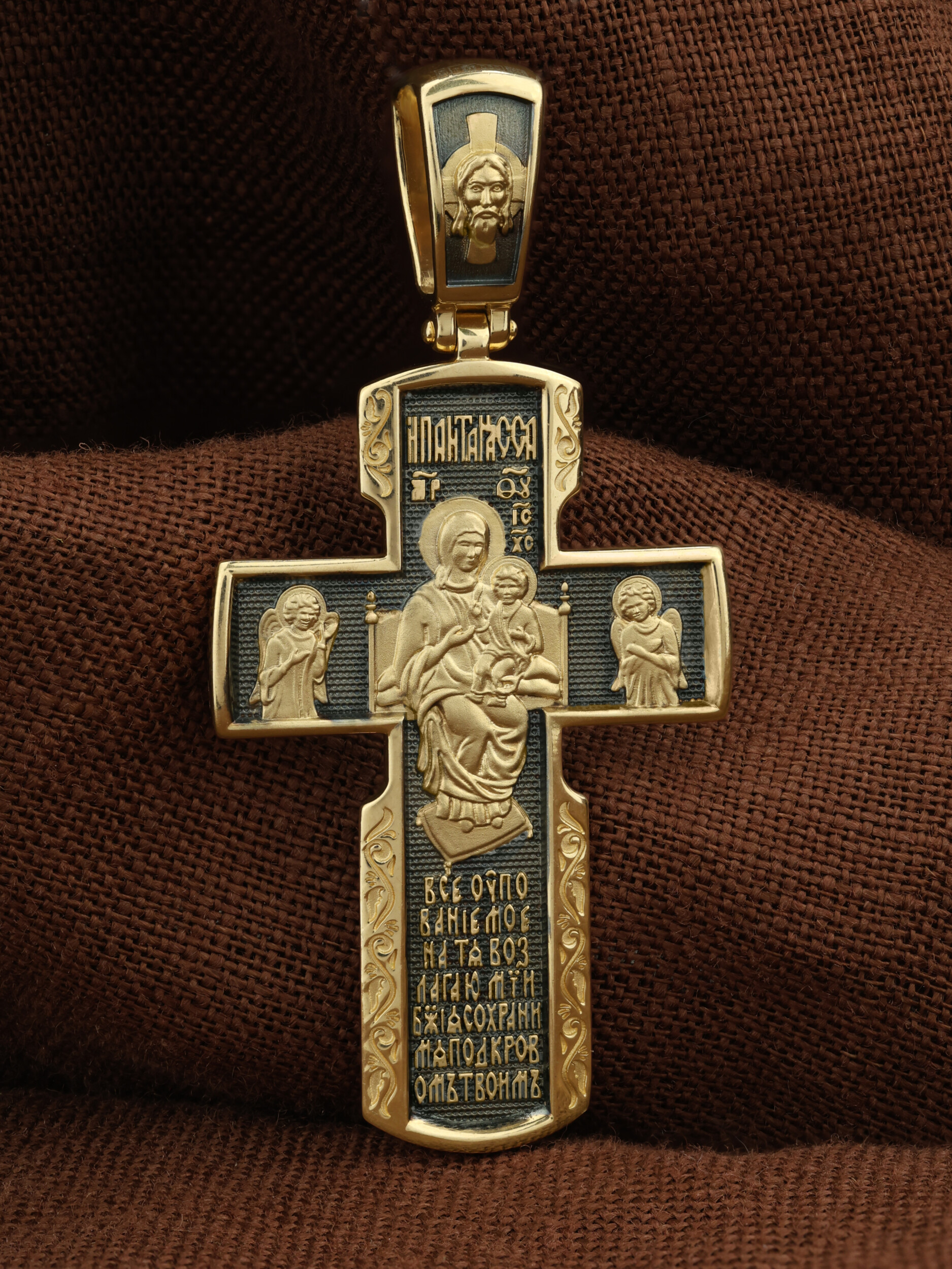 Весь оборот креста занимает икона Божией Матери «Всецарица». Внизу креста написана молитва обращенная к Божией Матери «Все упование мое на Тя возлагаю, Мати Божия, сохрани мя под кровом Твоим».