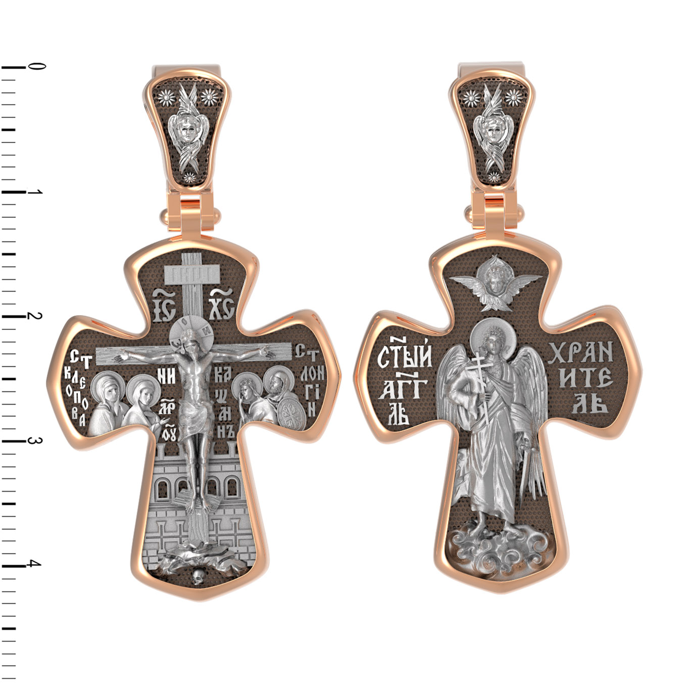На лицевой стороне креста изображено Распятие Господа и Спасителя нашего Иисуса Христа, отдавшего Себя на смерть, для искупления грехов мира. Господь сказал: кто хочет идти за Мною, отвергнись себя, и возьми крест свой, и следуй за Мною. (Мк. 8: 34). Крест является символом жертвенной любви всеблагого Бога к падшим людям, всепобеждающим духовным оружием христиан, основанием и средоточием церковной жизни. На верхней перекладине помещена надпись «IС» « ХС», что означает Иисус Христос. Ниже — слово «НИКА», что означает «победитель». Слева от Распятия изображена Пресвятая Богородица, справа — апостол и евангелист Иоанн Богослов, один из ближайших учеников Иисуса Христа. За Распятием высится Иерусалимская стена, в знак того, что Господь был распят вне стен города. Возвышение, на котором стоит Крест, символизирует гору Голгофу, на которой произошло Распятие. Под подножием Креста изображена покоящаяся голова (череп) Адама. На кулонном кольце помещен крест.