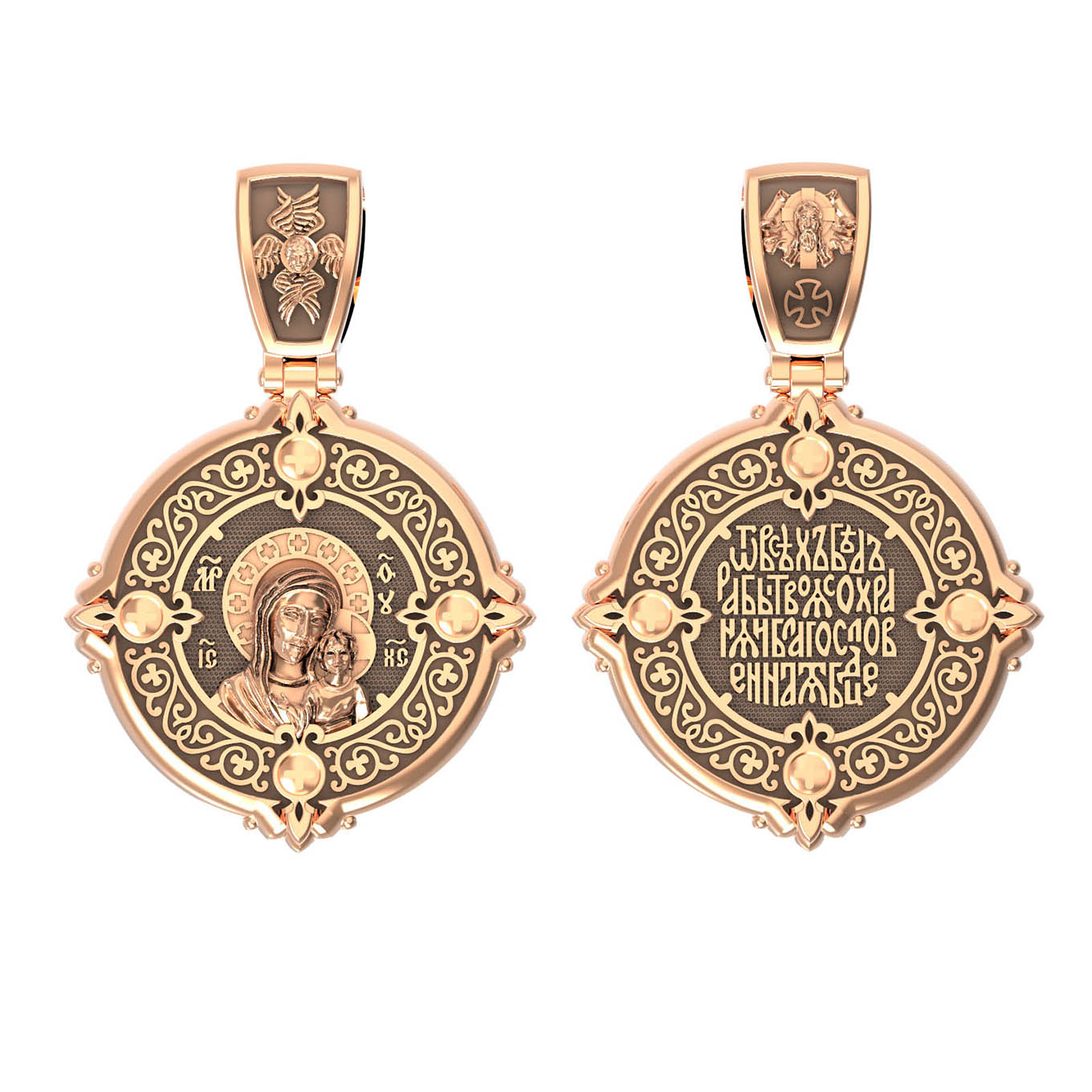 На обороте написана молитва к Богородице: «От всех бед рабы Твоя сохраняй, Благословенная Богородица!». На кулонном кольце изображен Спас Нерукотворный — Символ вочеловечившегося Божества и шестикрылый Серафим — самый приближенный к Господу Ангел.