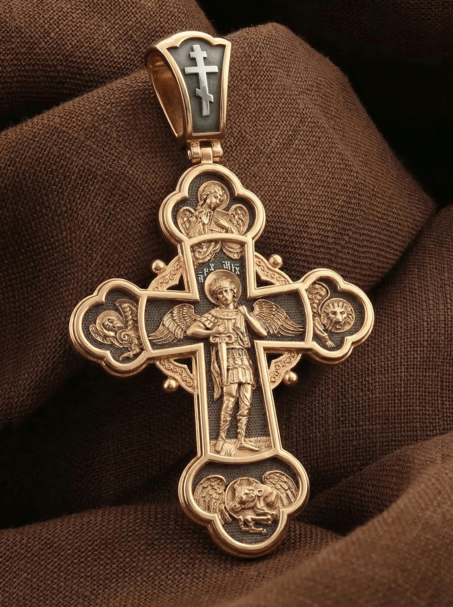 В центре оборота креста изображен Архистратиг Михаил. Могучий Архангел почитается как покровитель воинов и всех верных Богу и ведущих борьбу против сил зла, а также защитник душ умерших, страж райских врат. Над ним благословляющая десница — знак присутствия Бога. Архангел изображен в окружении символов четырех евангелистов: орел (Иоанн), лев (Марк), телец (Лука) и ангел (Матфей).