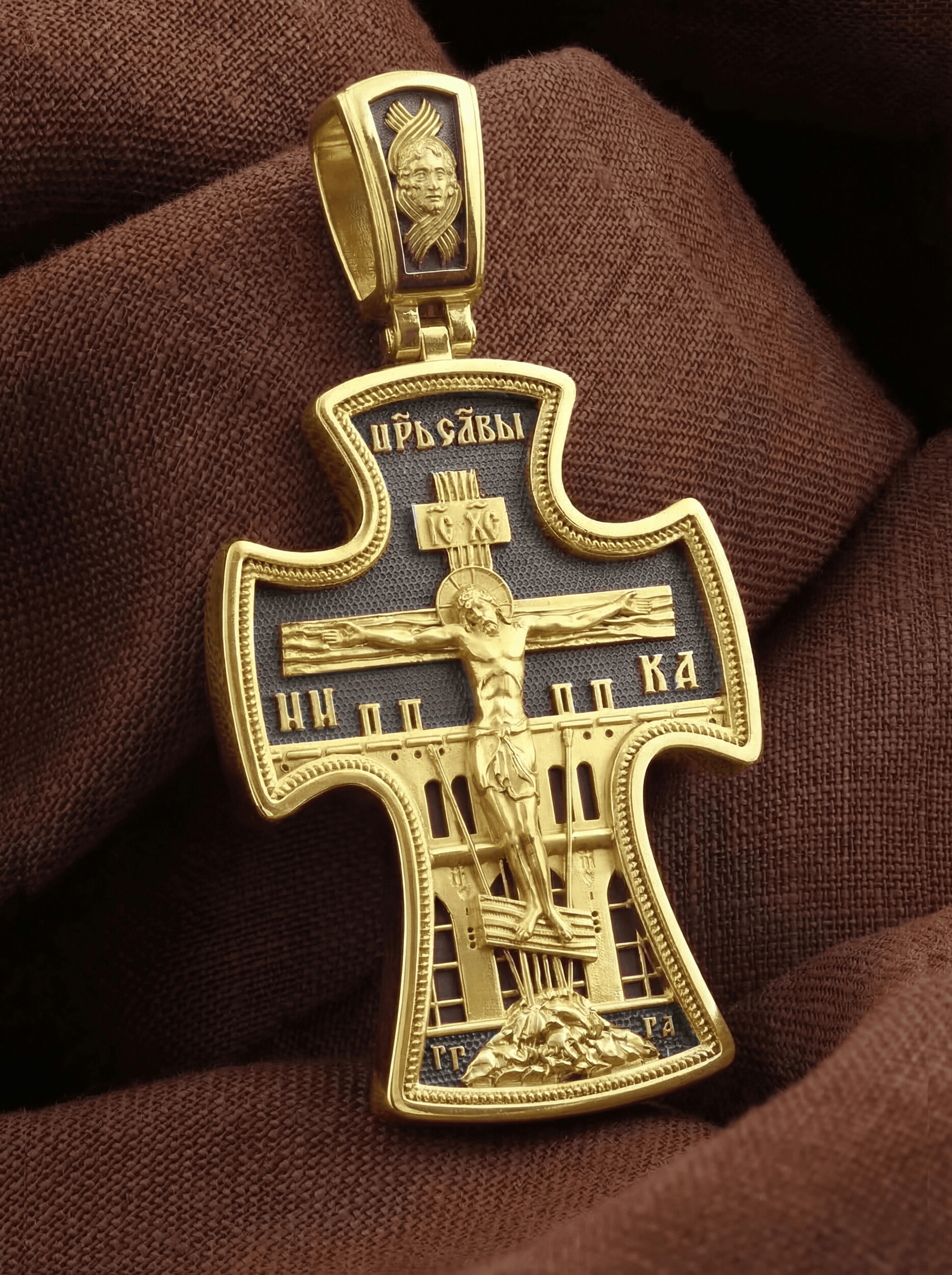 На лицевой стороне креста изображено Распятие, потому что это орудие казни Иисус Христос сделал орудием победы над грехом и смертью. Своими страданиями Он искупил грехи человечества, умерев и сошествовав во ад, победил сатану, освободил души праведников от вечной смерти и открыл им небесные врата рая. Жертва Христа сделала возможным спасение для каждого человека. На православном кресте Христос не умирает, а свободно простирает руки, ладони Иисуса открыты, будто он хочет обнять все человечество, даря им свою любовь и открывая путь к вечной жизни. Над титлом видим слова «ЦРЬ СЛВЫ» — Царь Славы. Верхняя перекладина символизирует собой табличку с надписью «IC XC» — Иисус Христос, ниже перекладины добавляется: «НИКА» (греч. — Победитель). Возвышение, на котором стоит Крест, символизирует гору Голгофу, на которой произошло Распятие. У подножия Креста изображают прах Адама, обозначенный черепом. По сторонам Голгофы начертаны буквы «ГГ» (Гора Голгофа) и «ГА» (голова Адама). Справа и слева от Креста изображены орудия страданий Господа — трость и копие, обозначенные буквами «Т» и «К».