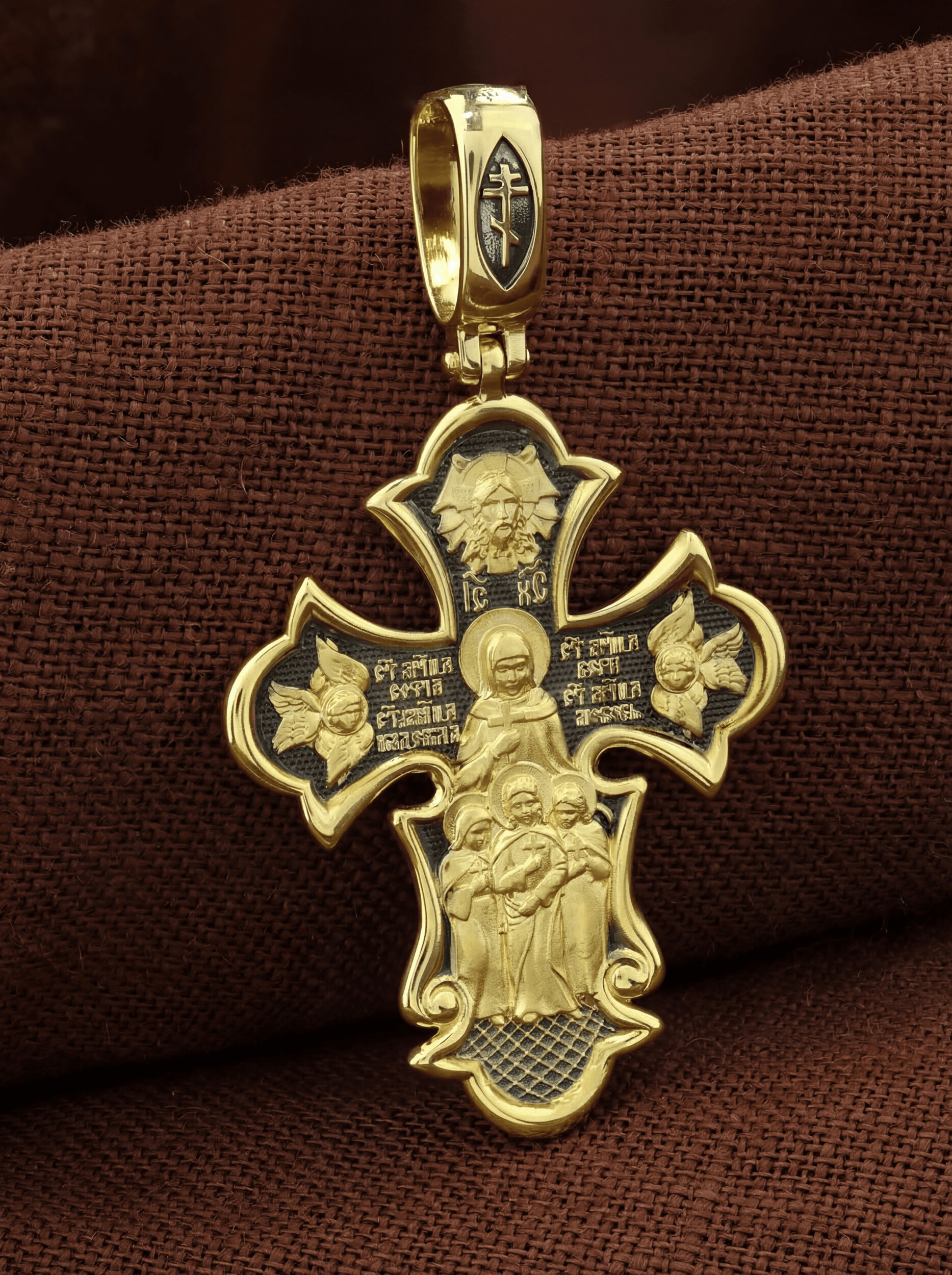 На оборотной стороне креста изображены Святые мученицы Вера, Надежда, Любовь и матерь их София, жившие во 2 веке нашей эры в Римской империи. Известно, что София была родом из Милана. Она рано овдовела, после чего перебралась в Рим. Своих дочерей София воспитывала в христианской вере и даже дала им имена в честь главных христианских добродетелей — Вера, Надежда и Любовь. В те годы римское государство жестоко преследовало верующих во Христа. Маленьких девочек (старшей Вере тогда было всего 12, а младшей Любови лишь 9) арестовали, подвергли истязаниям, а затем умертвили на глазах их матери. Сама София скончалась на следующий день у могилы своих дочерей. Но трагическая судьба на земле обернулась для мучениц вечной славой в ином мире. Церковь причислила их к лику святых и сегодня по молитвам к ним происходят чудеса. Выше образов мучениц изображен Спас Нерукотворный — образ Господа и Спасителя нашего Иисуса Христа, чудесно отпечатавшийся на плате, котором Христос вытер свой лик. По обеим сторонам креста изображены Ангелы Серафимы. На кулонном кольце помещен крест.
