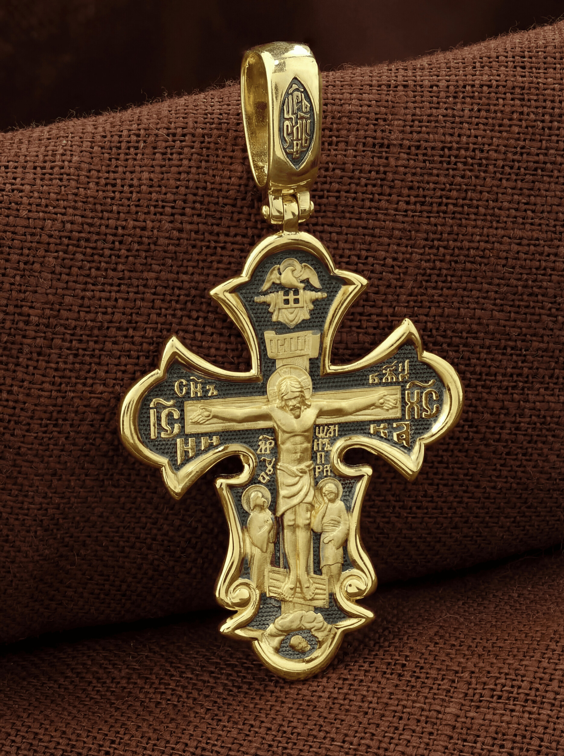 На лицевой стороне креста изображено Распятие Господа и Спасителя нашего Иисуса Христа, отдавшего Себя на смерть, для искупления грехов мира. Крест является символом жертвенной любви всеблагого Бога к падшим людям, всепобеждающим духовным оружием христиан, основанием и средоточием церковной жизни. Верхняя перекладина символизирует титло — табличку, на которой, согласно Евангелию, было начертано: Иисус Назорей Царь Иудейский (IНЦI). Также Распятие сопровождается надписями, олицетворяющими Христа. Надпись «IС» « ХС», что означает Иисус Христос, слово «НИКА», что означает «победитель» и слова «Сын Божий» помещается на разных сторонах поперечной перекладины креста. Над вершиной Распятия помещено изображение Святого Духа в виде голубя. Слева от Распятия изображена Пресвятая Богородица, справа — апостол и евангелист Иоанн Богослов, один из ближайших учеников Иисуса Христа. Возвышение, на котором стоит Крест, символизирует гору Голгофу, на которой произошло Распятие. Под подножием Креста изображена покоящаяся голова (череп) Адама. На кулонном кольце помещена надпись «Царь Славы».