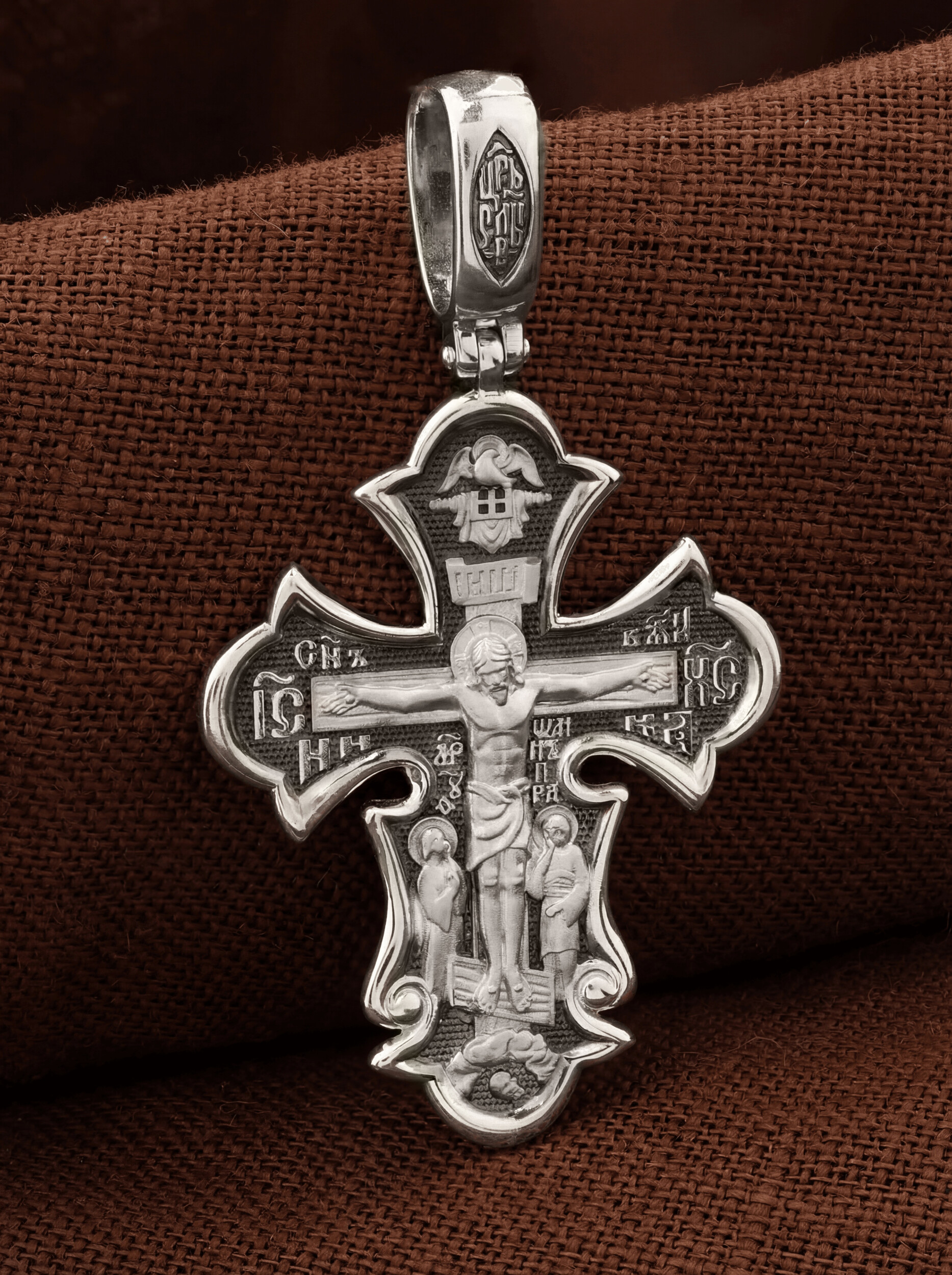 На лицевой стороне креста изображено Распятие Господа и Спасителя нашего Иисуса Христа, отдавшего Себя на смерть, для искупления грехов мира. Крест является символом жертвенной любви всеблагого Бога к падшим людям, всепобеждающим духовным оружием христиан, основанием и средоточием церковной жизни. Верхняя перекладина символизирует титло — табличку, на которой, согласно Евангелию, было начертано: Иисус Назорей Царь Иудейский (IНЦI). Также Распятие сопровождается надписями, олицетворяющими Христа. Надпись «IС» « ХС», что означает Иисус Христос, слово «НИКА», что означает «победитель» и слова «Сын Божий» помещается на разных сторонах поперечной перекладины креста. Над вершиной Распятия помещено изображение Святого Духа в виде голубя. Слева от Распятия изображена Пресвятая Богородица, справа — апостол и евангелист Иоанн Богослов, один из ближайших учеников Иисуса Христа. Возвышение, на котором стоит Крест, символизирует гору Голгофу, на которой произошло Распятие. Под подножием Креста изображена покоящаяся голова (череп) Адама. На кулонном кольце помещена надпись «Царь Славы».