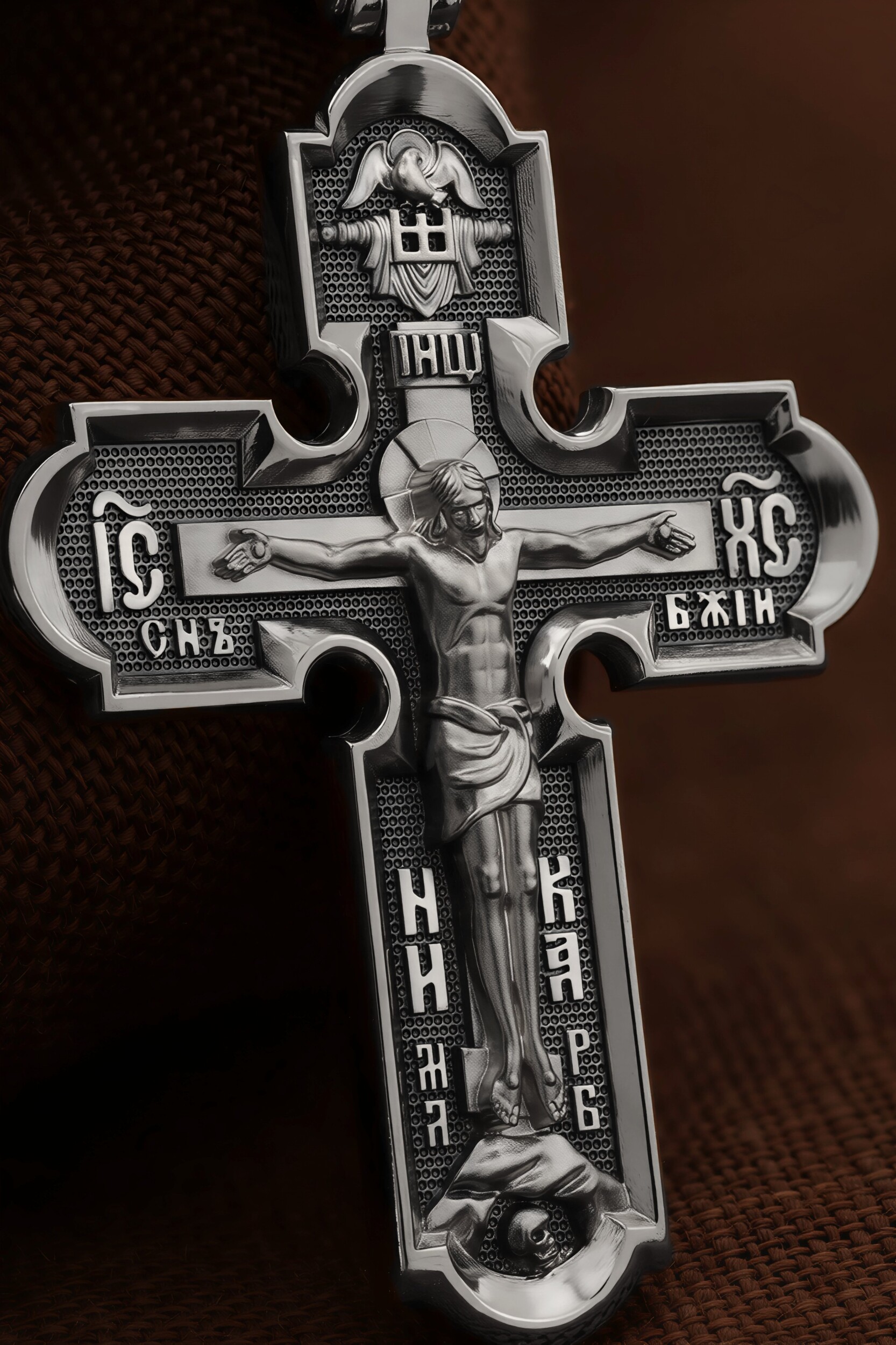 На лицевой стороне креста изображено Распятие Господа и Спасителя нашего Иисуса Христа. Крест- символ спасения и искупления рода человеческого, знамение победы над смертью и адом. Иисус Христос, как искупительная жертва освобождения человечества от власти греха, умер крестной смертью и в третий день воскрес. Верхняя перекладина символизирует титло — табличку, на которой, согласно Евангелию, было начертано: Иисус Назорей Царь Иудейский (IНЦI). Надпись «IC» «ХC», означает Иисус Христос, помещается на разных сторонах поперечной перекладины креста. Ниже перекладины расположено словосочетание «СЫН БОЖИЙ», что означает божественную природу Иисуса Христа. Надпись «МЛРБ» — «место лобное рай бысть» означает, что место лобное стало раем и помещаются в нижней части креста. Рядом — слово «НИКА», что означает «победитель». Возвышение, на котором стоит Крест, символизирует гору Голгофу, на которой произошло Распятие. Под подножием Креста изображена покоящаяся голова (череп) Адама. На кулонном кольце изображен шестикрылый Серафим.