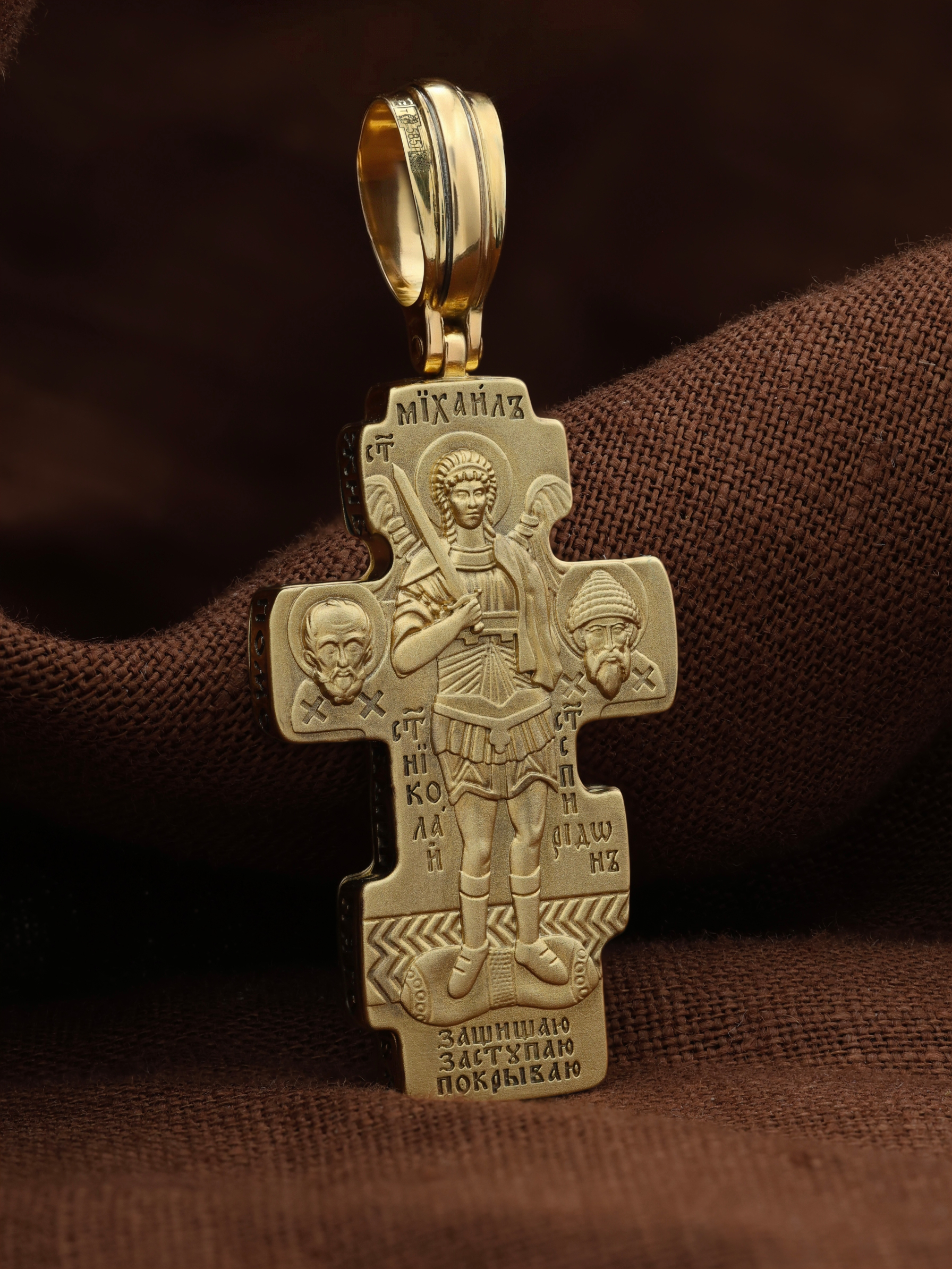 Центральную часть оборотной стороны креста занимает изображение Архангела Михаила — верного служителя Божия, который низринул с Неба возгордившегося денницу с другими павшими духами. В Православии его называют Архистратигом, что означает глава святого воинства Ангелов и Архангелов. Архангел Михаил изображен в воинственном виде с огненным мечом в правой руке. Архангел почитается как покровитель воинов и всех верных Богу и ведущих борьбу против сил зла, борец против ересей, а также защитник душ умерших, страж райских врат. С древних времен прославлен своими чудесами Архангел Михаил на Руси. Слева от образа Архангела изображен Святитель Николай Чудотворец, архиепископ Мир Ликийских, справа — Святитель Спиридон Тримифутский Чудотворец. Святители являются одними из самых почитаемых святых в православном мире. На торцевой стороне креста размещены слова молитвы из 90-го псалма: «Живый в помощи Вышняго, в крове Бога Небеснаго водворится. Речет…»