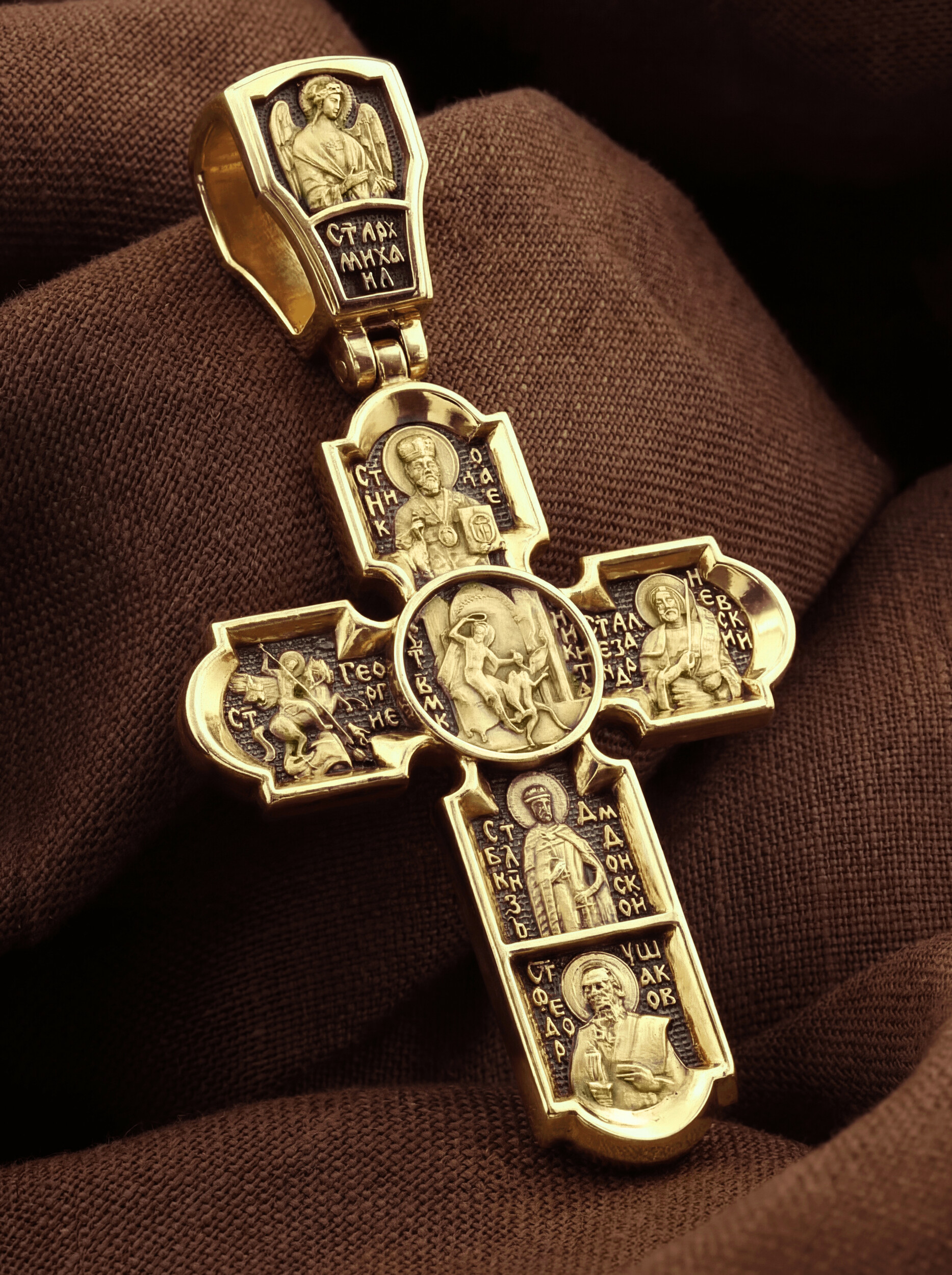 На лицевой стороне креста изображено Распятие Господа и Спасителя нашего Иисуса Христа. Христос, подвергнутый на кресте мучительной казни, своими страданиями искупил нас от древнего греха и даровал нам жизнь вечную. Без Распятия не было бы Воскресения Христова, и поэтому Крест из орудия казни обратился в святыню, в которой действует Благодать Божия. Над Распятием изображен Дух Святой в виде голубя, сходящего с Небес. Распятие сопровождается каноническими надписями. На верхней табличке, выше головы Иисуса, расположена надпись, составленная Понтием Пилатом на трех языках — «IНЦI». Она означает «Иисус Назорей, Царь Иудейский». Надпись «IС ХС» означает Иисус Христос и помещается на разных сторонах поперечной (большой) перекладины креста. Ниже — словосочетание «СЫН БОЖИЙ», что означает божественную природу Иисуса Христа. Крест стоит на горе камней, символизирующих Голгофу. В ее основании различается череп — это голова Адама. Надписи «Ника», что означает Победитель, и надпись «МЛРБ» — «место лобное рай бысть», что означает место лобное стало раем, размещены в нижней части креста. На кулонном кольце изображен шестикрылый Серафим.