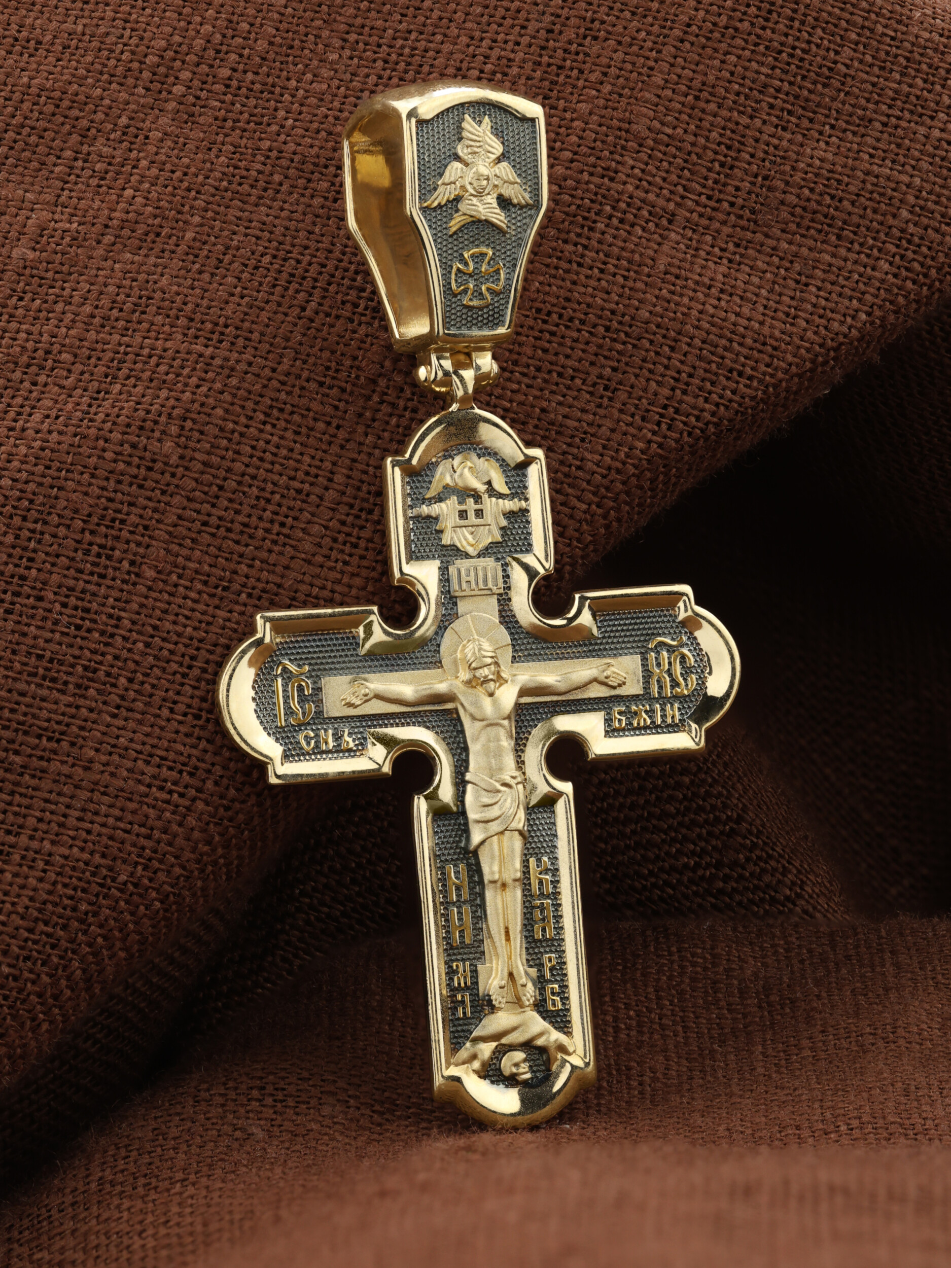 На лицевой стороне креста изображено Распятие Господа и Спасителя нашего Иисуса Христа. Христос, подвергнутый на кресте мучительной казни, своими страданиями искупил нас от древнего греха и даровал нам жизнь вечную. Без Распятия не было бы Воскресения Христова, и поэтому Крест из орудия казни обратился в святыню, в которой действует Благодать Божия. Над Распятием изображен Дух Святой в виде голубя, сходящего с Небес. Распятие сопровождается каноническими надписями. На верхней табличке, выше головы Иисуса, расположена надпись, составленная Понтием Пилатом на трех языках — «IНЦI». Она означает «Иисус Назорей, Царь Иудейский». Надпись «IС ХС» означает Иисус Христос и помещается на разных сторонах поперечной (большой) перекладины креста. Ниже — словосочетание «СЫН БОЖИЙ», что означает божественную природу Иисуса Христа. Крест стоит на горе камней, символизирующих Голгофу. В ее основании различается череп — это голова Адама. Надписи «Ника», что означает Победитель, и надпись «МЛРБ» — «место лобное рай бысть», что означает место лобное стало раем, размещены в нижней части креста. На кулонном кольце изображен шестикрылый Серафим.