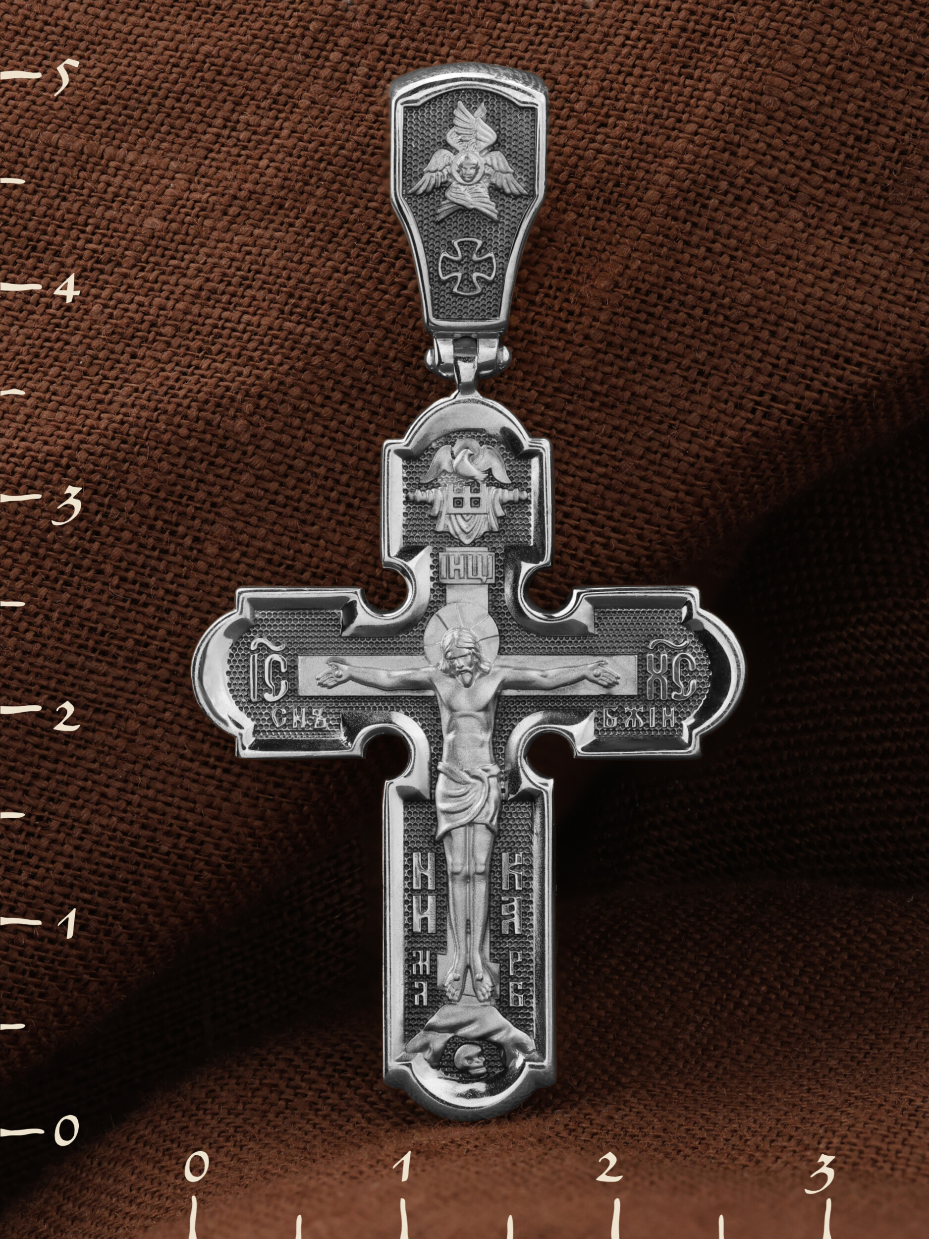 На лицевой стороне креста изображено Распятие Господа и Спасителя нашего Иисуса Христа. Христос, подвергнутый на кресте мучительной казни, своими страданиями искупил нас от древнего греха и даровал нам жизнь вечную. Без Распятия не было бы Воскресения Христова, и поэтому Крест из орудия казни обратился в святыню, в которой действует Благодать Божия. Над Распятием изображен Дух Святой в виде голубя, сходящего с Небес. Распятие сопровождается каноническими надписями. На верхней табличке, выше головы Иисуса, расположена надпись, составленная Понтием Пилатом на трех языках — «IНЦI». Она означает «Иисус Назорей, Царь Иудейский». Надпись «IС ХС» означает Иисус Христос и помещается на разных сторонах поперечной (большой) перекладины креста. Ниже — словосочетание «СЫН БОЖИЙ», что означает божественную природу Иисуса Христа. Крест стоит на горе камней, символизирующих Голгофу. В ее основании различается череп — это голова Адама. Надписи «Ника», что означает Победитель, и надпись «МЛРБ» — «место лобное рай бысть», что означает место лобное стало раем, размещены в нижней части креста. На кулонном кольце изображен шестикрылый Серафим.