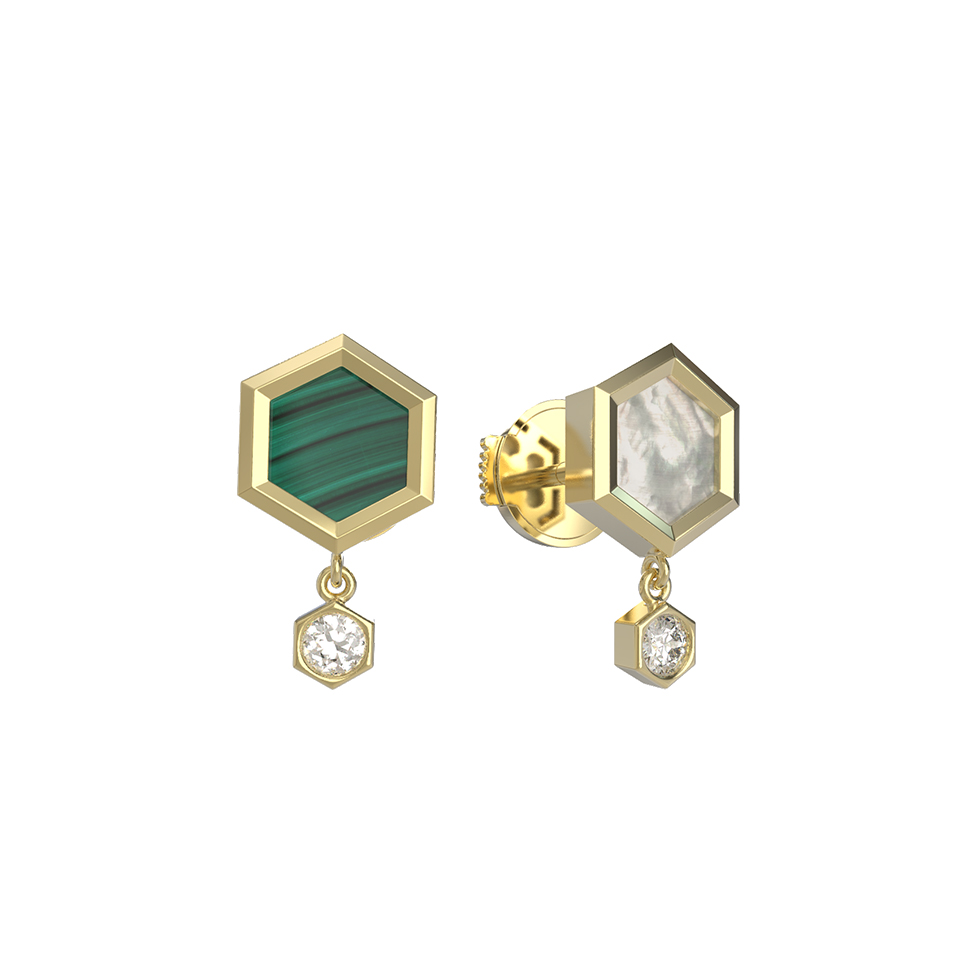 Серьги из лимонного золота c бриллиантами, малахитом и перламутром