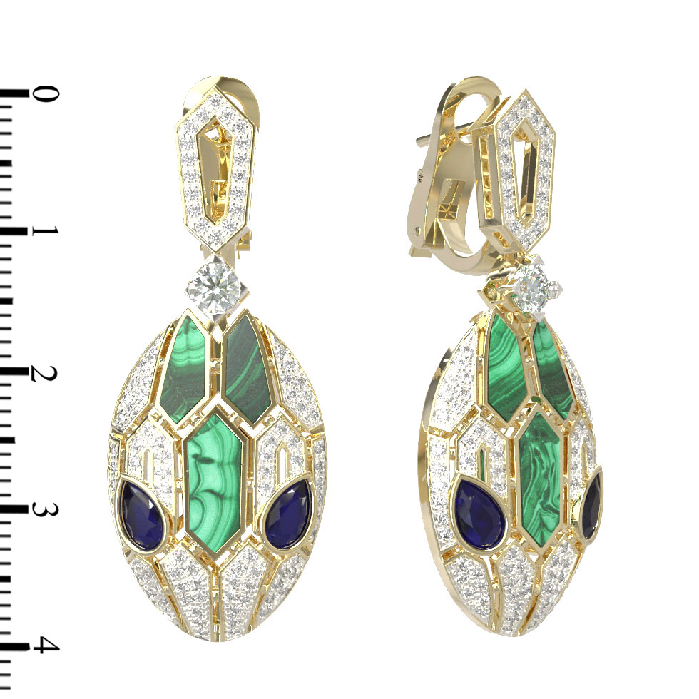 Серьги из лимонного золота c бриллиантами, сапфиром и малахитом