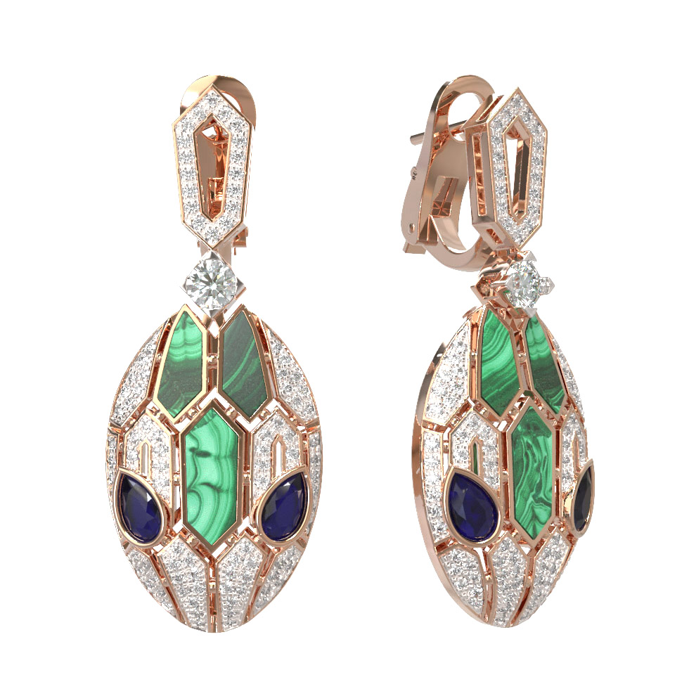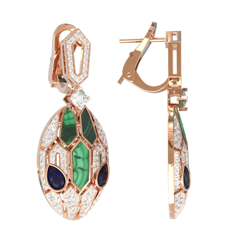 Серьги из золота c бриллиантами, сапфиром и малахитом