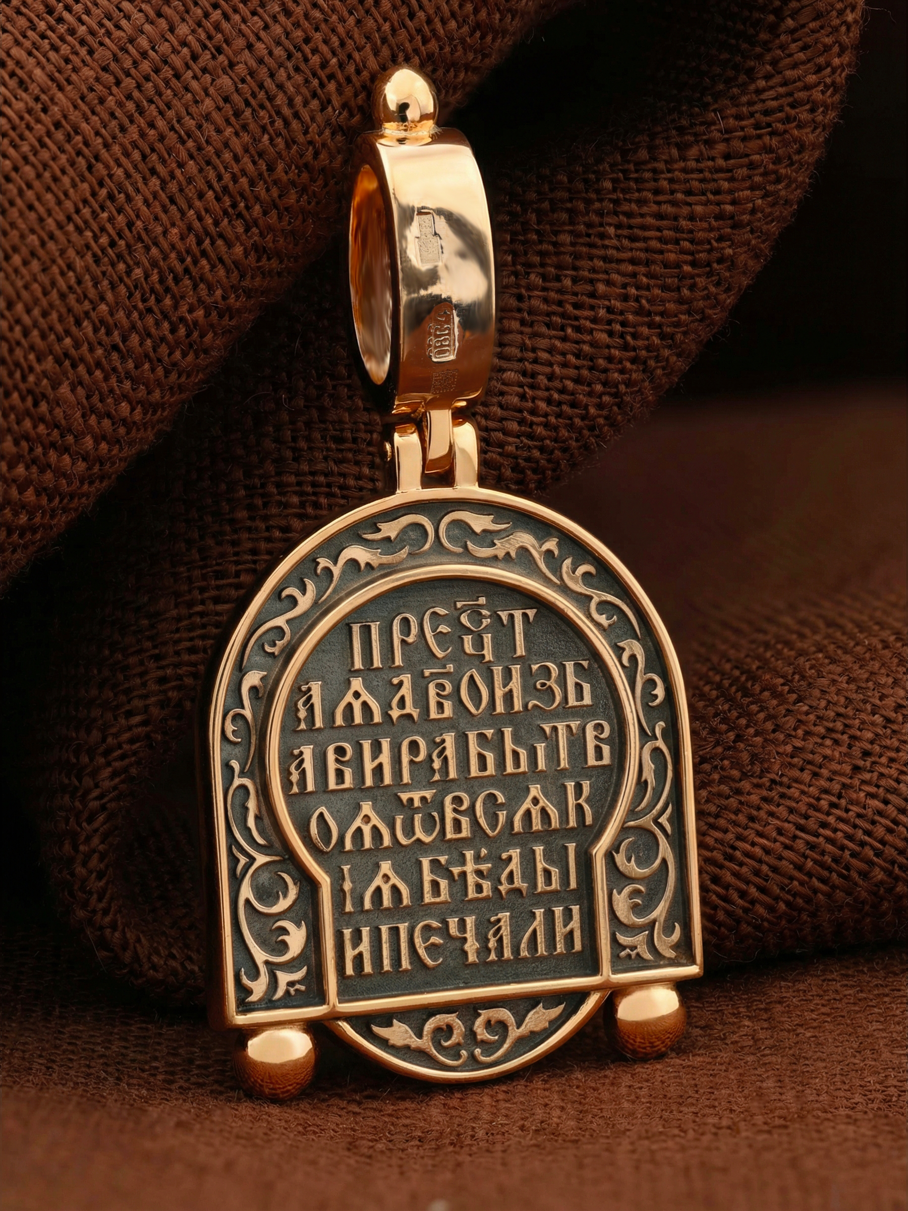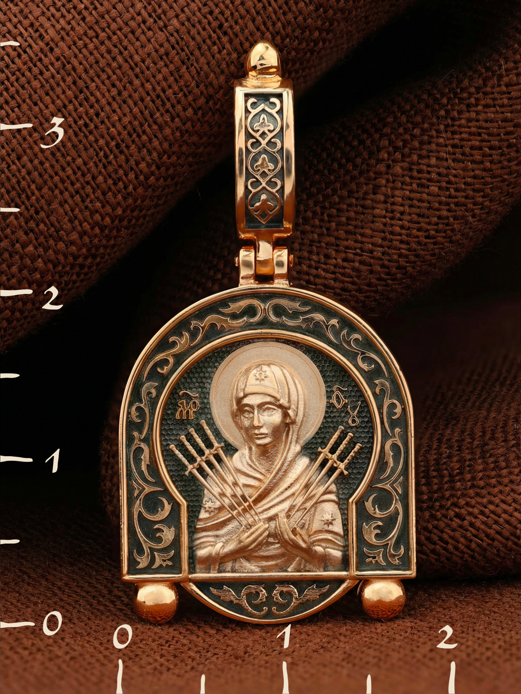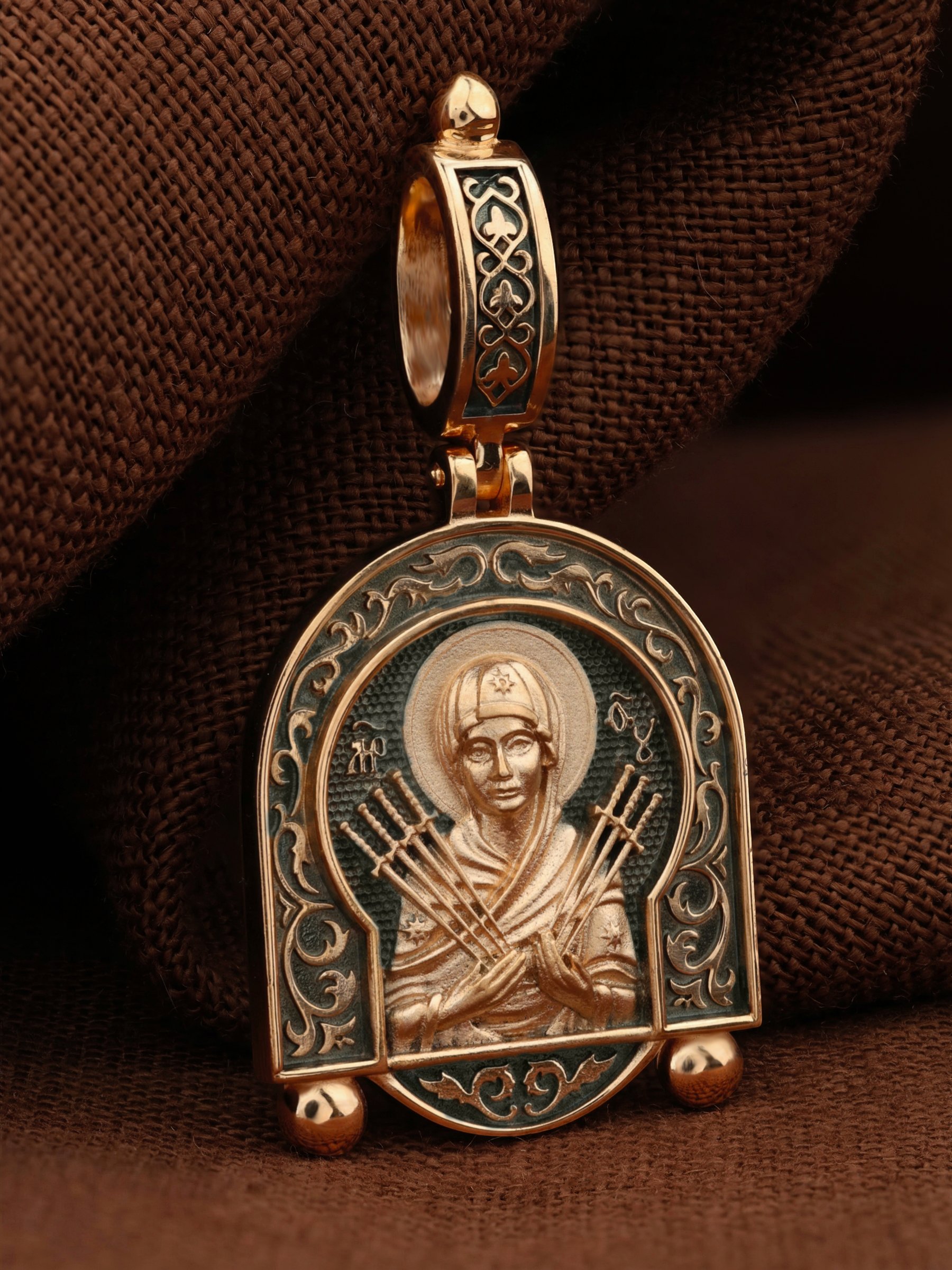 На лицевой стороне образка изображена икона Пресвятой Богородицы «Семистрельная» — одна из самых чудотворных икон на Руси. На протяжении многих веков христиане взывали к Царице Небесной через эту икону, если в стране начинались войны или мятежи.