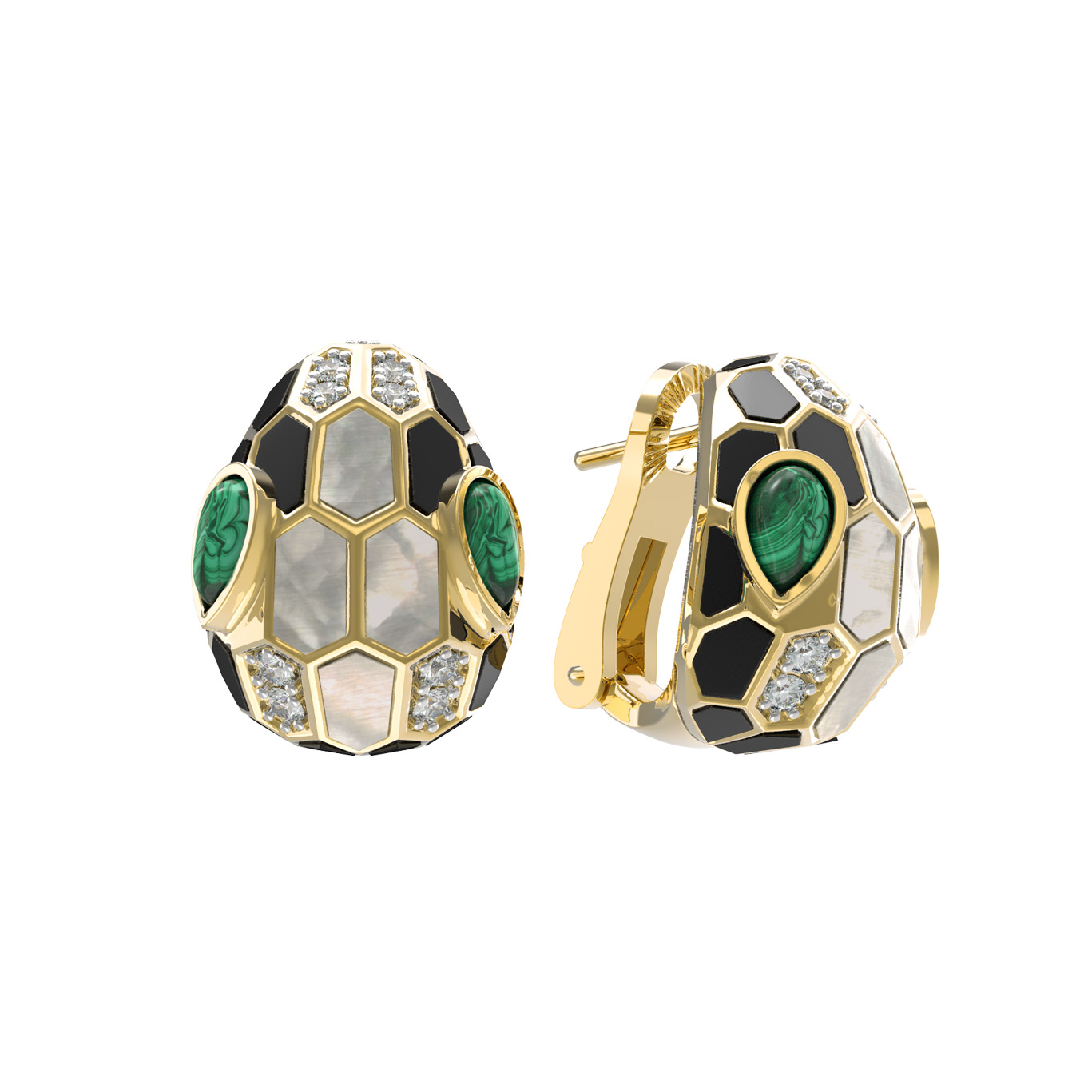 Серьги из лимонного золота c бриллиантами, рубином, ониксом, малахитом и перламутром