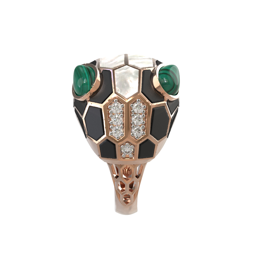 Кольцо из золота c бриллиантами, рубином, ониксом, малахитом и перламутром