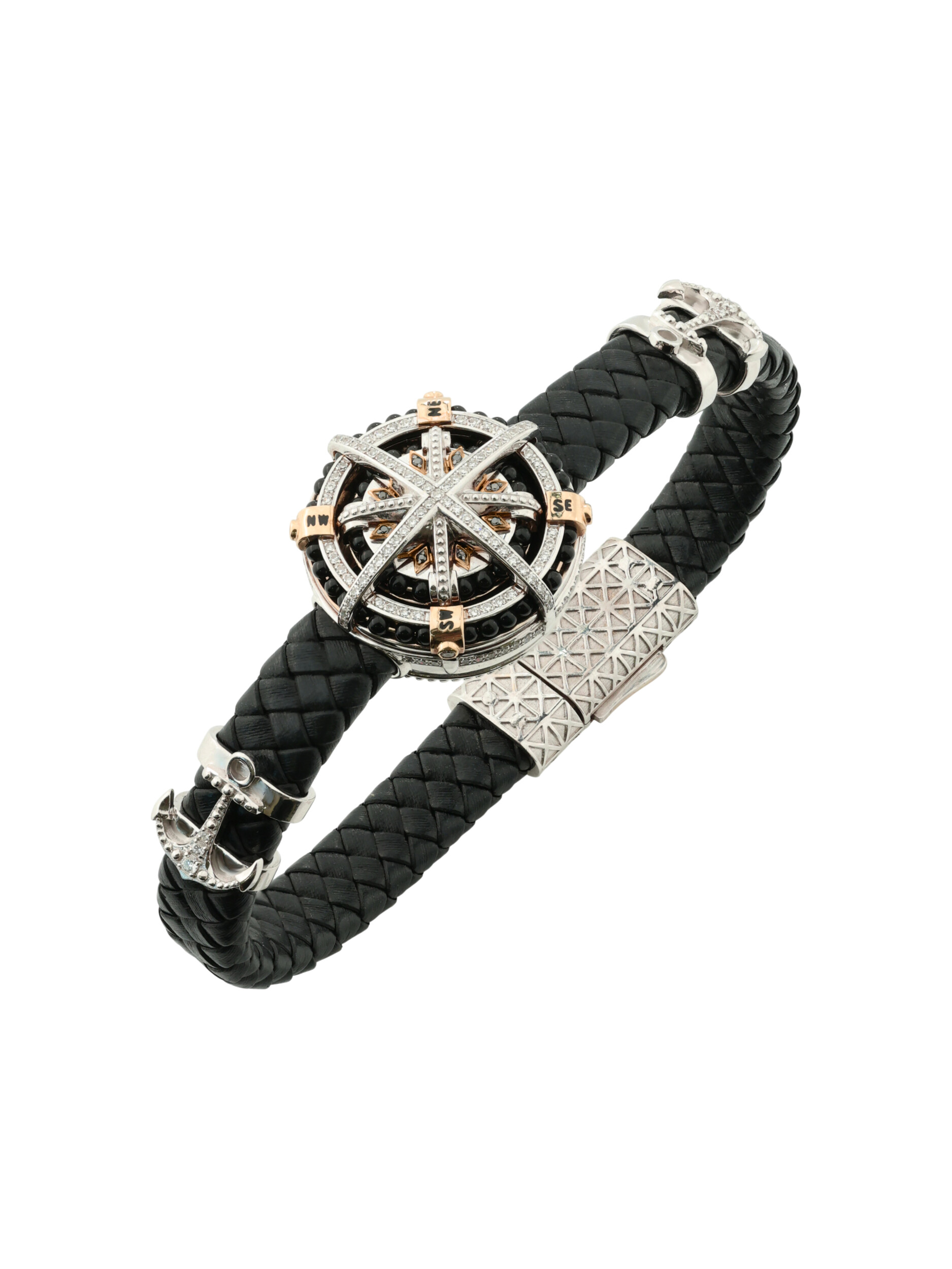 Браслет из белого золота c эмалью, бриллиантами, кожаным шнурком и ониксом