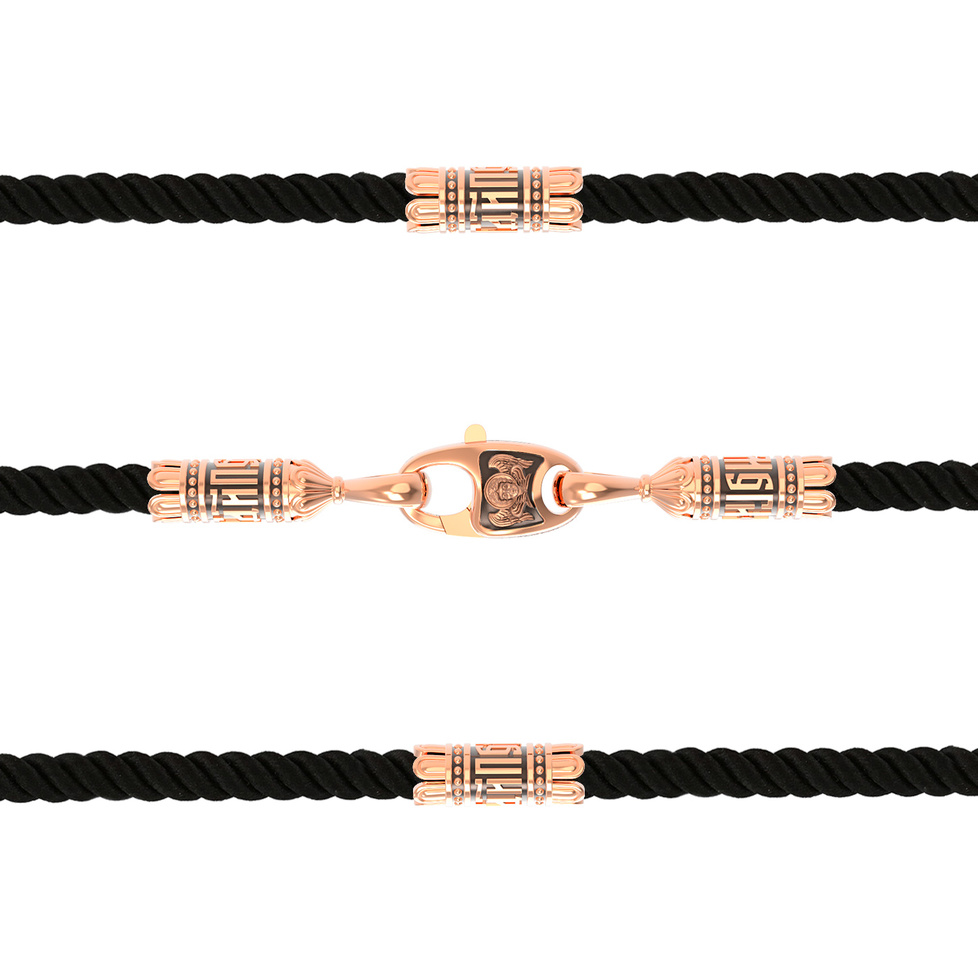 На шнурке цепи-шнурка расположены вставки, а на концах концевики с надписью: «Спаси и сохрани». Соединяет концевики замочек-карабин в форме рыбки. На замочке изображен шестикрылый Серафим.