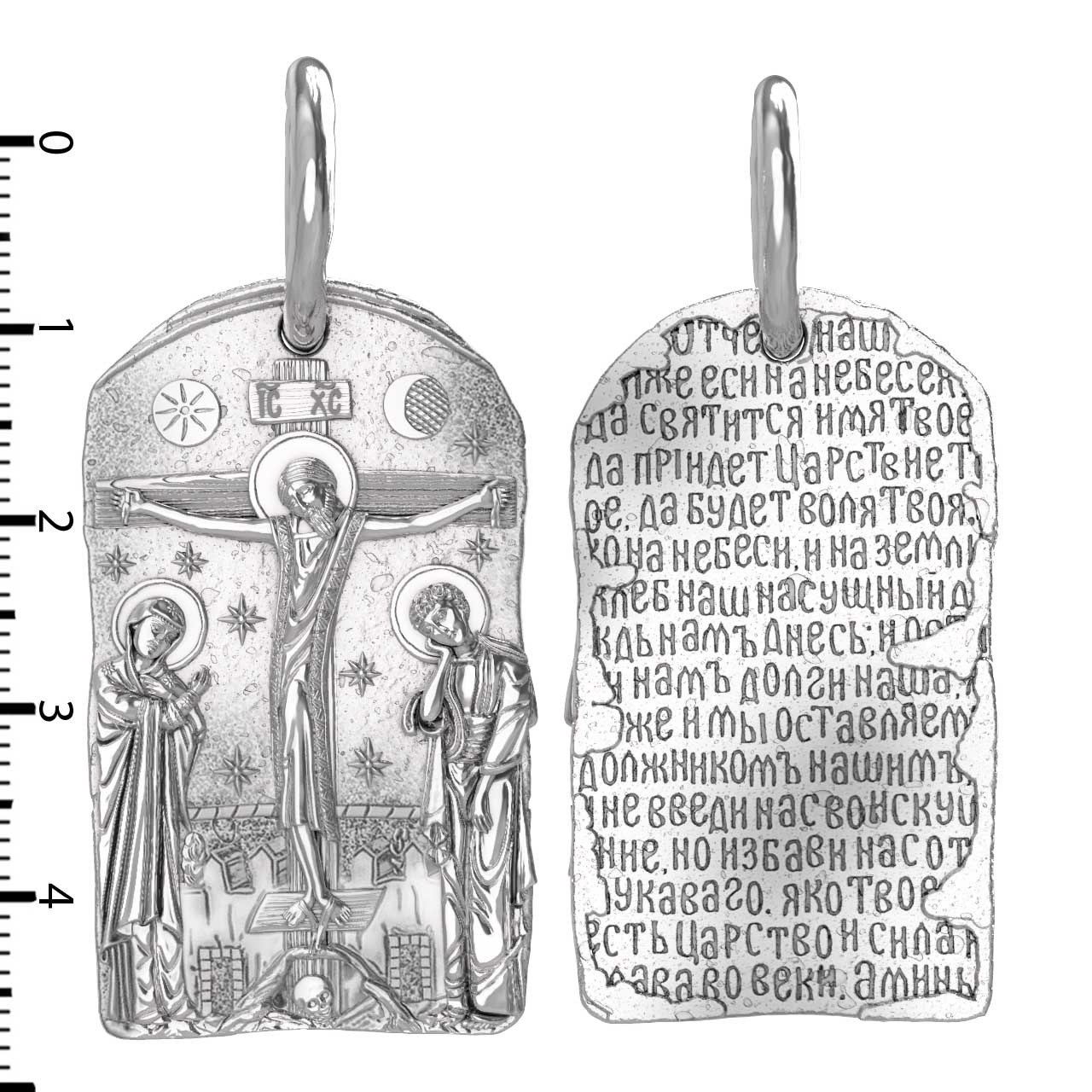 На лицевой стороне образка изображено Распятие Господа и Спасителя нашего Иисуса Христа. Своими крестными страданиями Господь смыл наши грехи, покрыл наш долг перед Богом. В Голгофе сокрыта непостижимая тайна бесконечной правды и любви Бога. Крест стал символом победы добра над злом, жизни над смертью, напоминанием бесконечной Божьей любви, предметом радости. Воплотившийся Сын Божий Своею кровью освятил крест и сделал его проводником Своей благодати, источником освящения верующих. На верхней табличке, выше головы Иисуса, написано сокращенно имя Спасителя «IC» «XC» — Иисус Христос. Слева от Распятия стоят оплакивающие Господа Пресвятая Богородица, справа — апостол и евангелист Иоанн Богослов, один из ближайших учеников Иисуса Христа. По преданию, увидя, что они горько плачут, Иисус сказал Матери Своей: «Жено! Се сын Твой!» Потом сказал ученику Иоанну: «Се мати твоя». С этого времени Иоанн взял Матерь Божию к себе, и Она жила в его доме до самой смерти.
