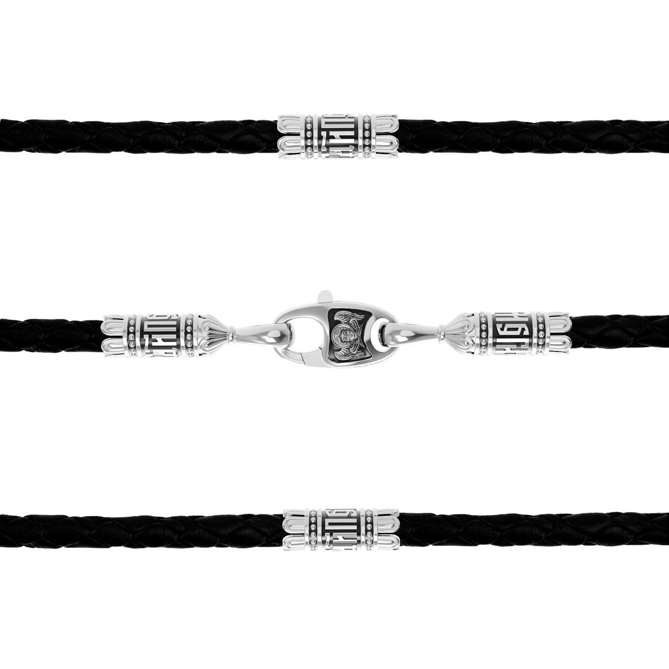 На шнурке цепи-шнурка расположены вставки, а на концах концевики с надписью: «Спаси и сохрани». Соединяет концевики замочек-карабин в форме рыбки. На замочке изображен шестикрылый Серафим.