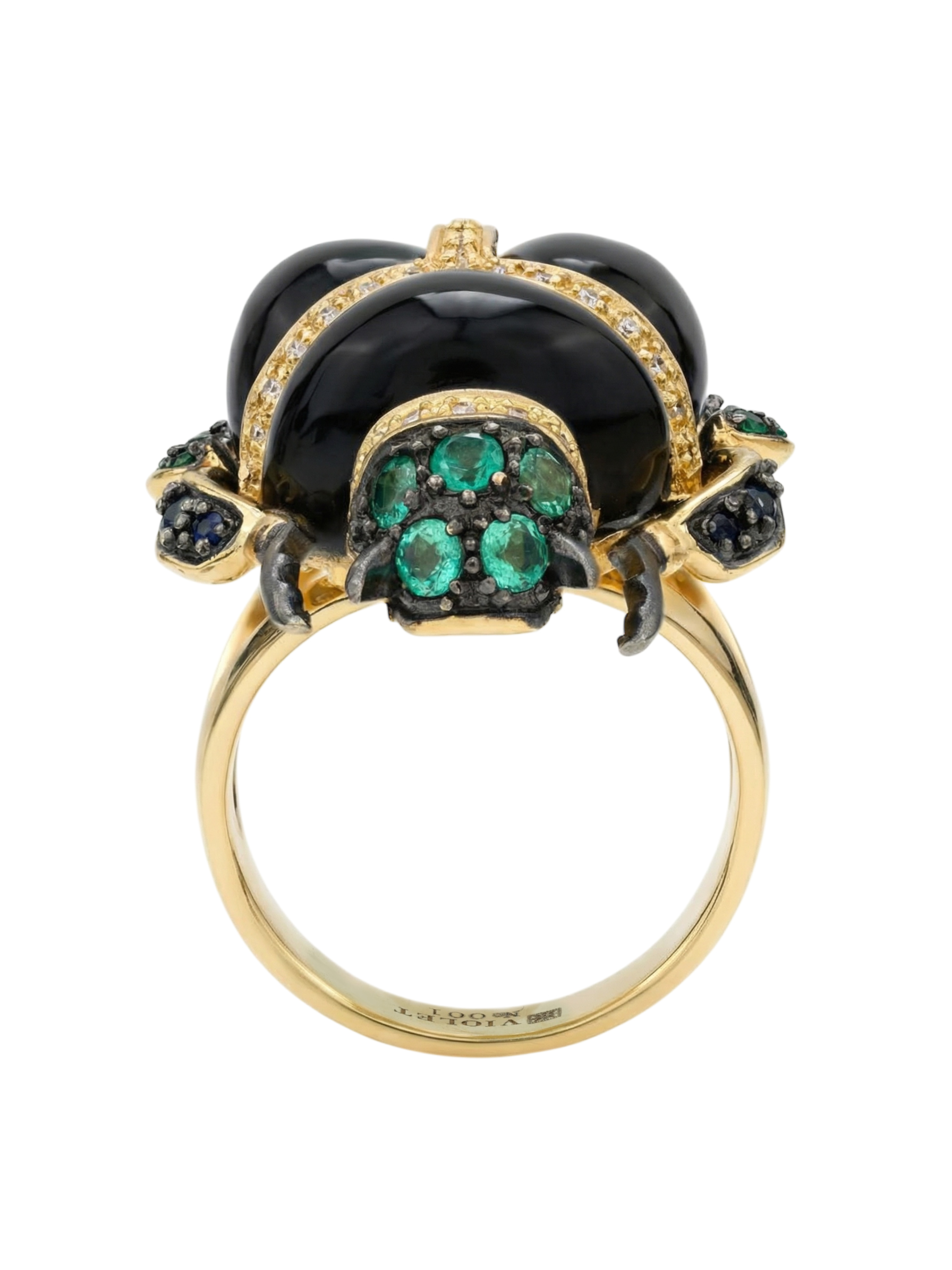Кольцо из лимонного золота c бриллиантами, сапфиром, изумрудом и ониксом